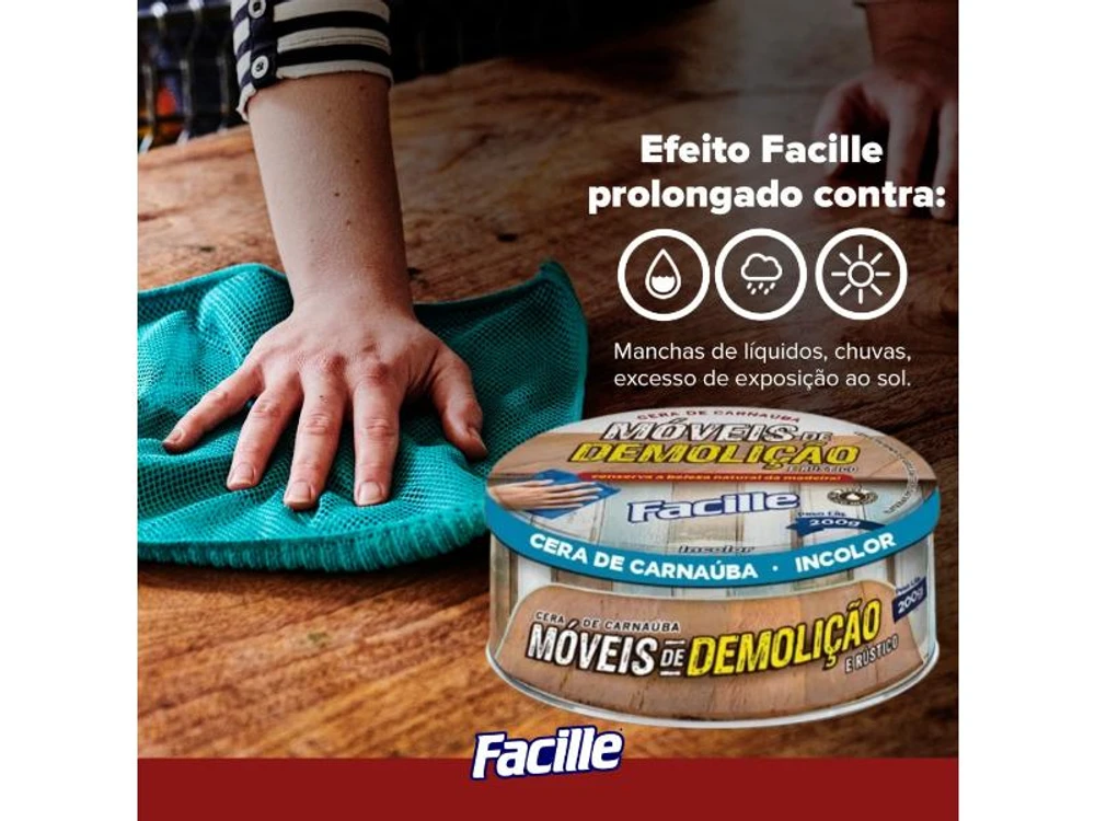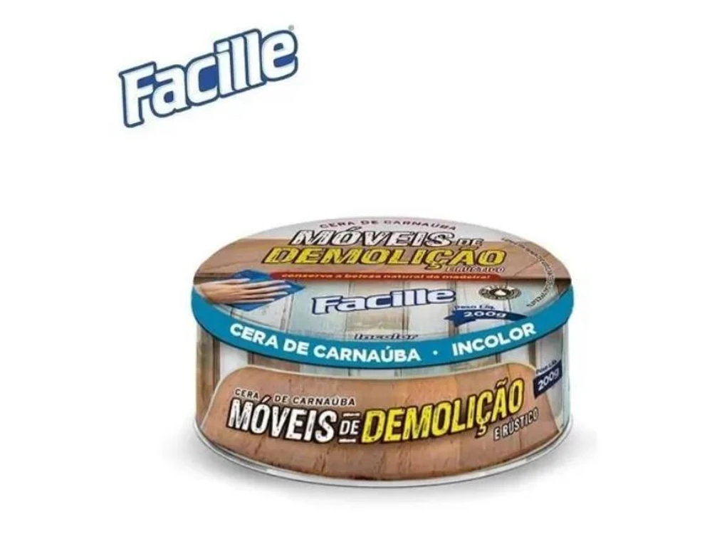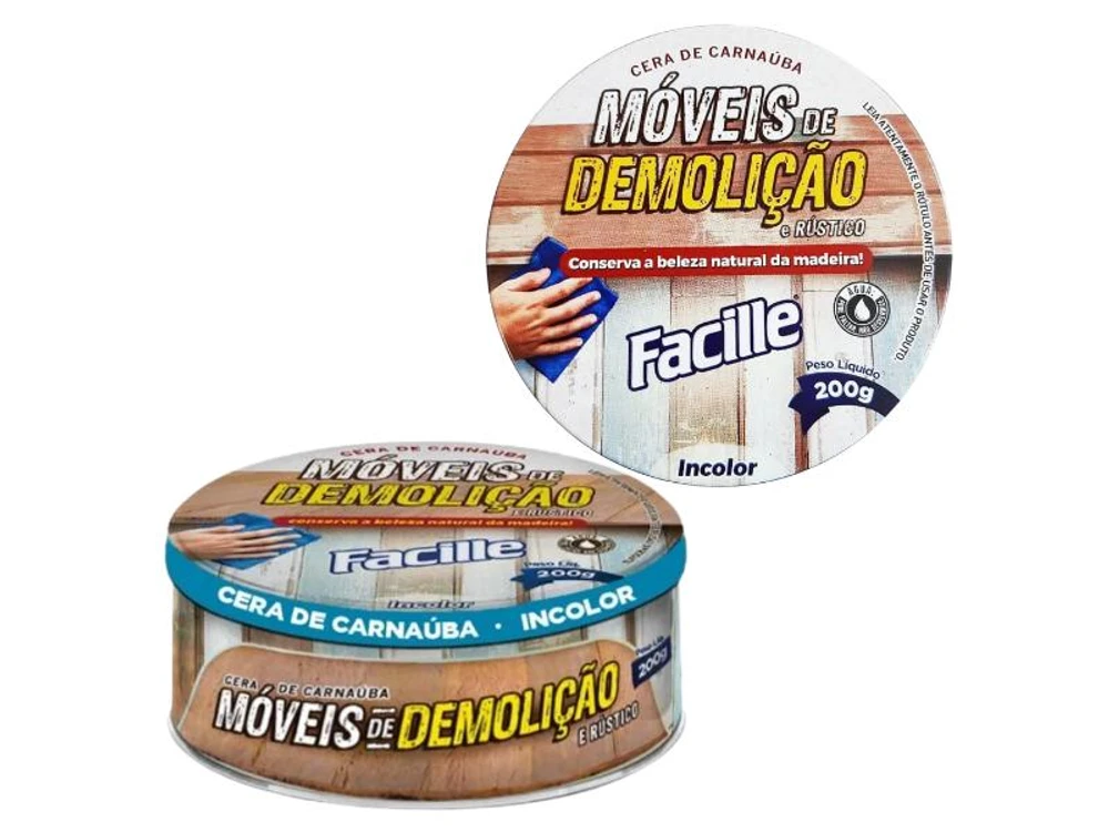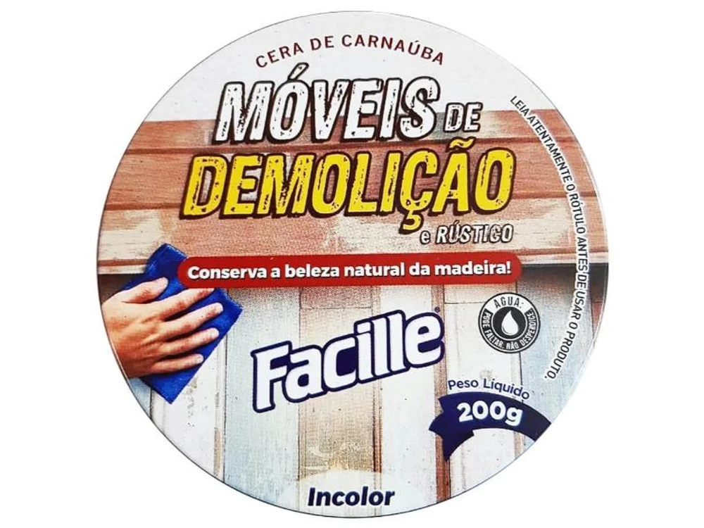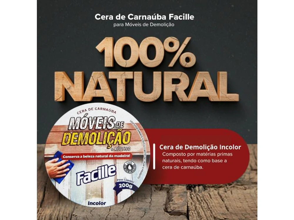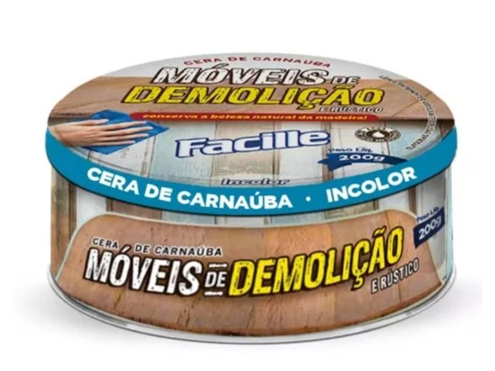 Cera de Carnaúba para Móveis de Demolição e Rústico 200g. Composta por matérias primas naturais, tem como base a cera de carnaúba que cria uma camada protetora, conservando o aspecto natural da madeira por mais tempo. Fácil aplicação e efeito duradouro contra manchas de líquidos, chuvas, excesso de exposição ao sol e riscos em geral.