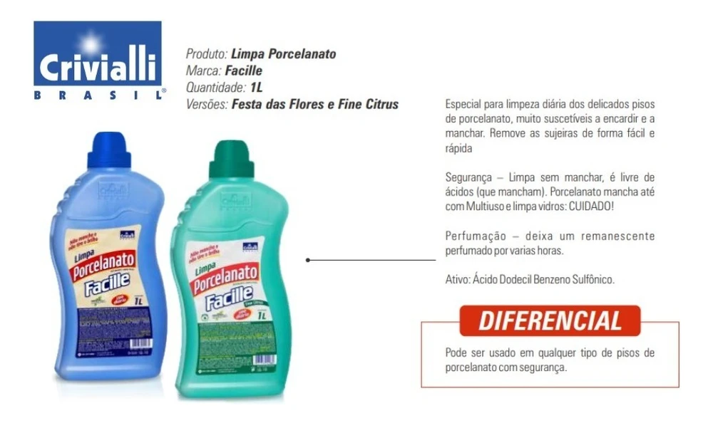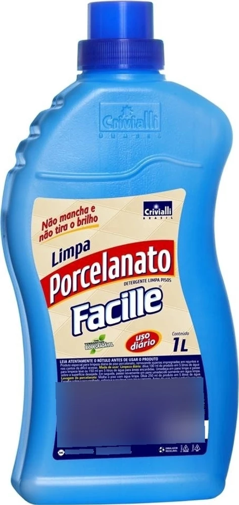 Produto: Limpa Porcelanato Kit 02 und de 01 LtMarca: FacilleQuantidade: 1LVersões: Festa das FloresEspecial para limpeza diária dos delicados pisos de porcelanato, muito suscetíveis a encardir e a manchar. Remove as sujeiras de forma fácil e rápida Segurança ? Limpa sem manchar, é livre de ácidos (que mancham).Porcelanato mancha até com Multiuso e limpa vidros: CUIDADO!Perfumação ? deixa um remanescente perfumado por varias horas.Ativo: Ácido Dodecil Benzeno Sulfônico.Pode ser usado em qualquer tipo de pisos de porcelanato com segurança.