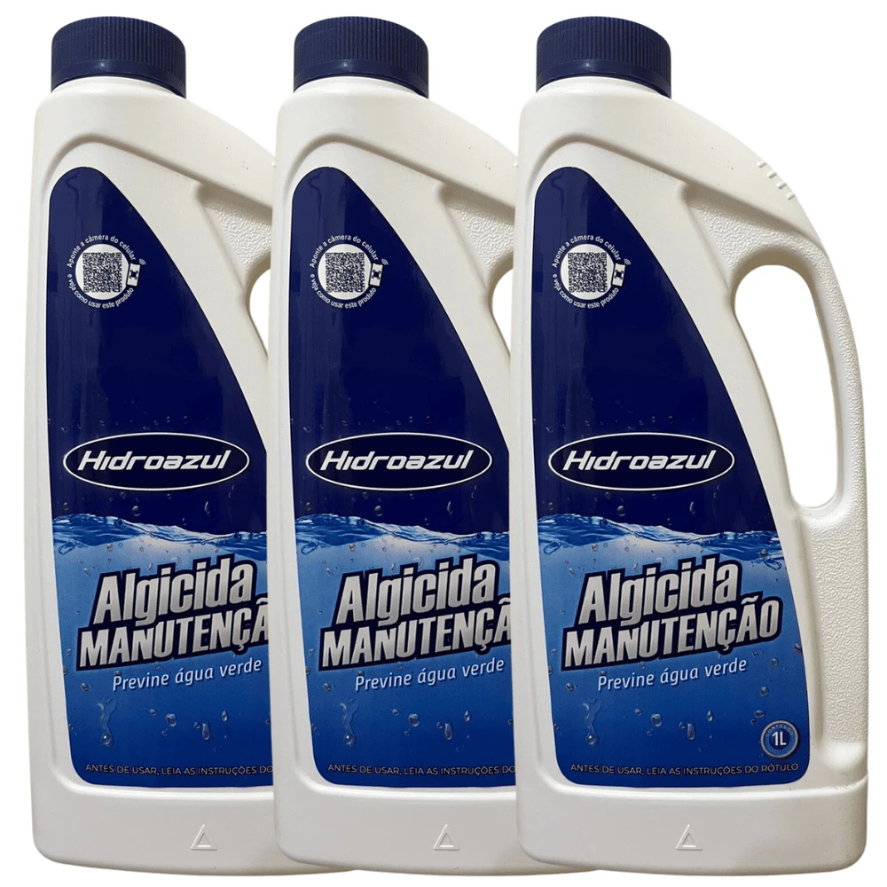 O Algicida Manutenção Hidroazul é um produto desenvolvido para prevenir a formação e a proliferação de algas, microrganismos que tornam a água da piscina verde e turva, com pisos e paredes escorregadias. Pode ser utilizado em todos os tipos de piscinas. Este produto não deve ser aplicado em conjunto com o cloro. Dê um intervalo de aproximadamente 8 horas entre a aplicação do Algicida Manutenção e o cloro.