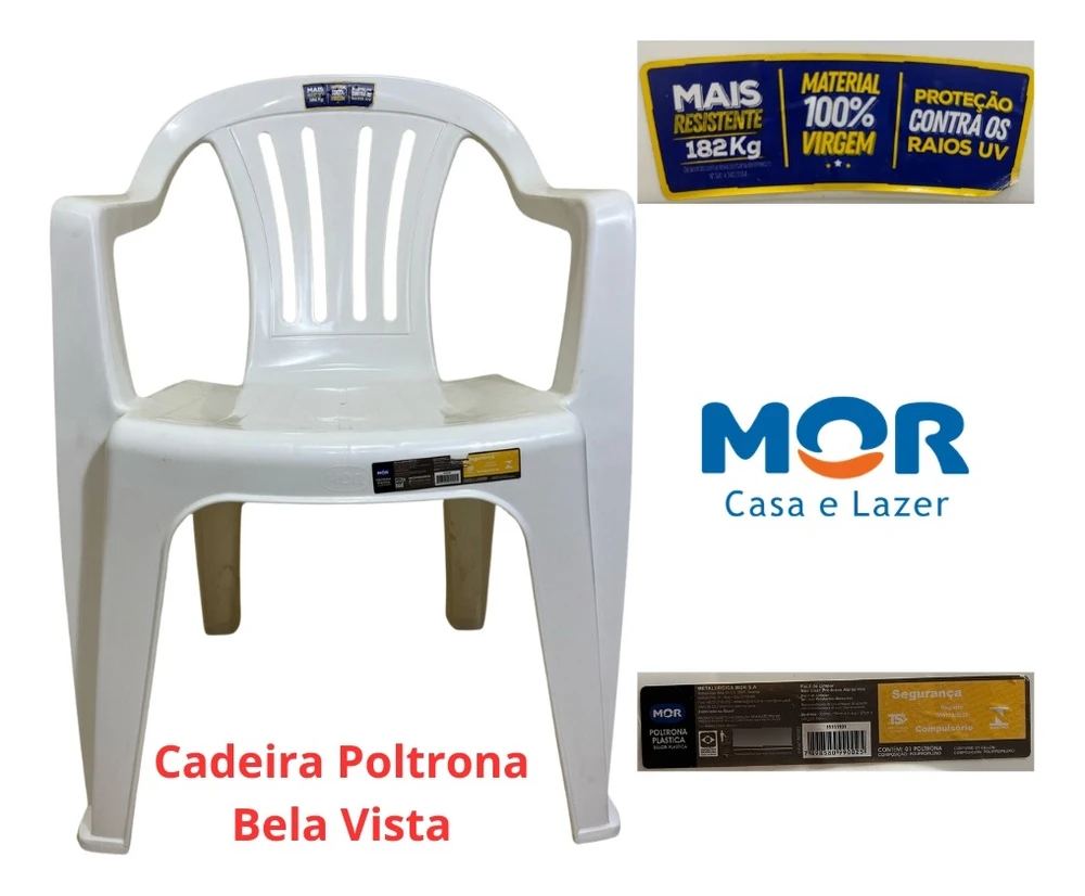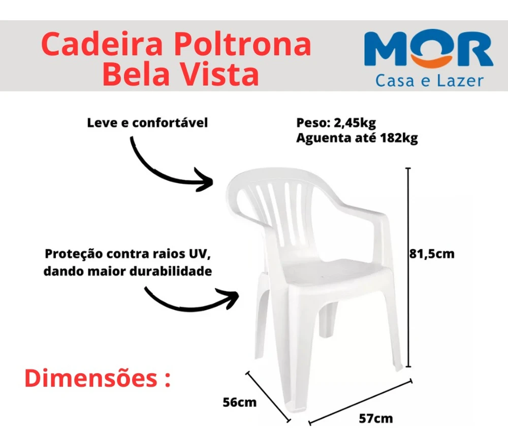 Com encosto para os braços, são confortáveis e muito leves para transportar. Também permite que sejam empilhadas, facilitando seu armazenamento. Um produto com a garantia de qualidade Mor!