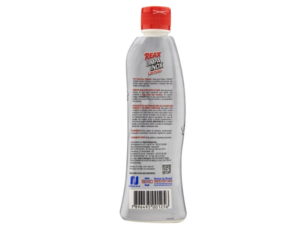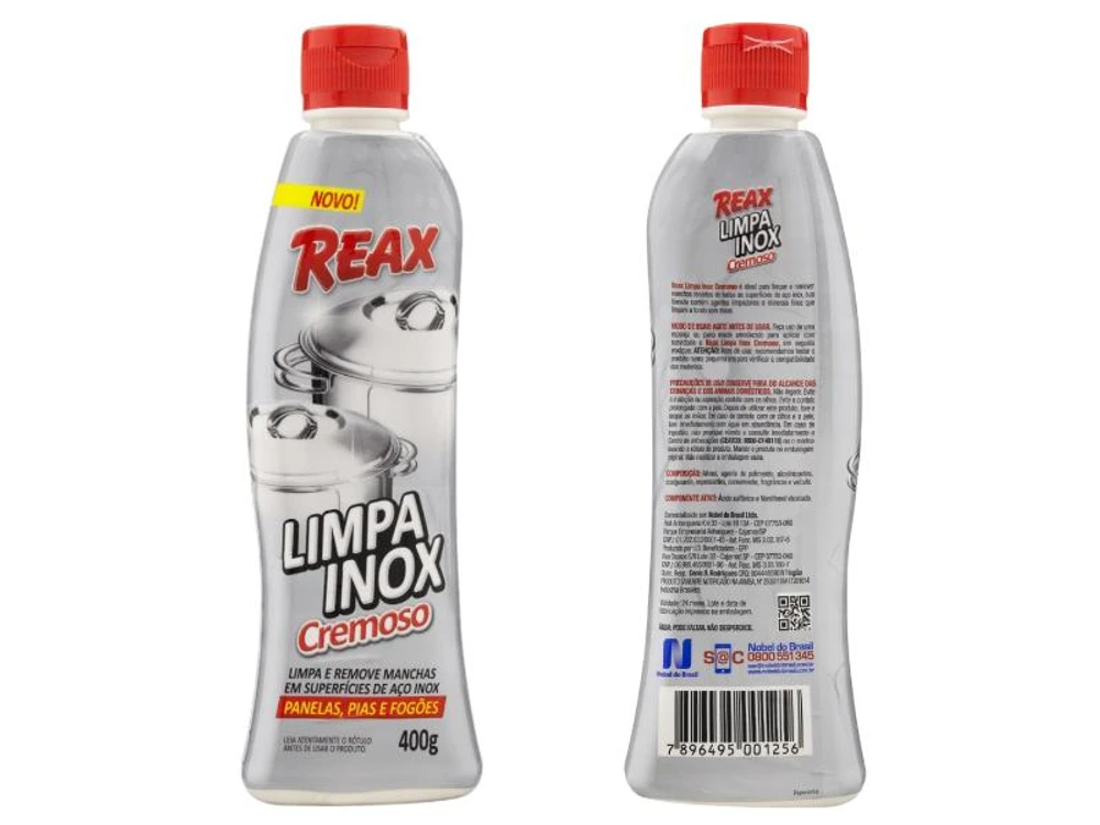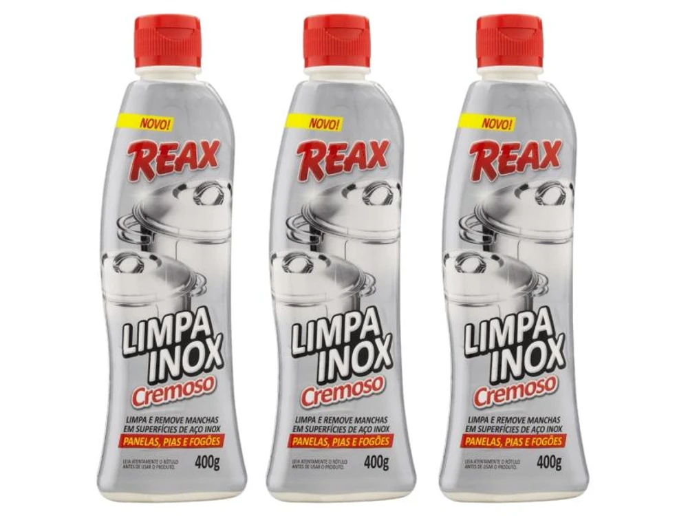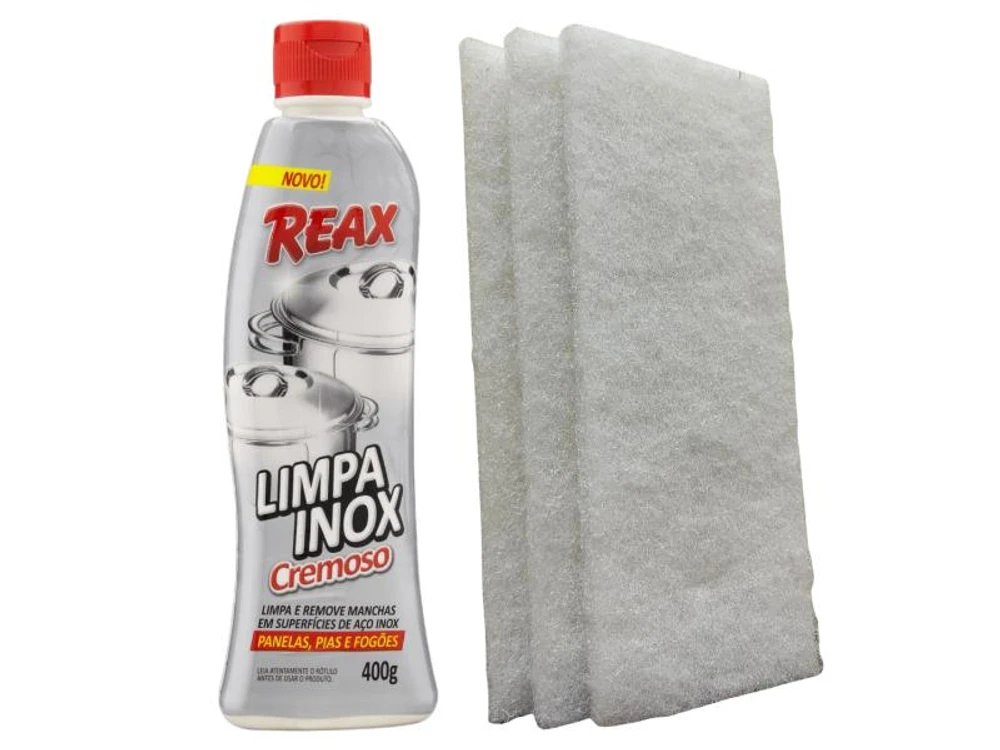 Modo de usar: Agite antes de usar. Faça uso de uma esponja ou pano macio umedecido para aplicar com suavidade o Reax Limpa Inox Cremoso, em seguida enxágue. Atenção: Antes de usar, recomendamos testar o produto numa pequena área para verificar a compatibilidade dos materiais.