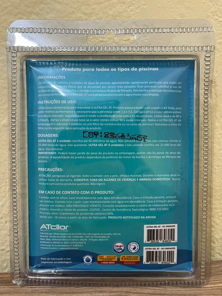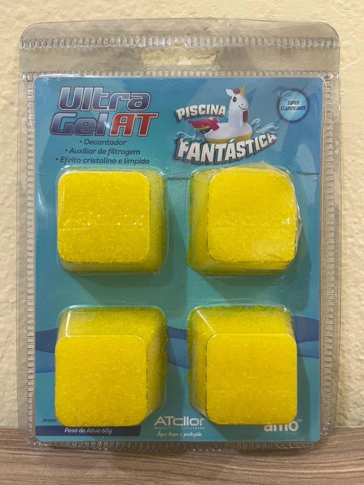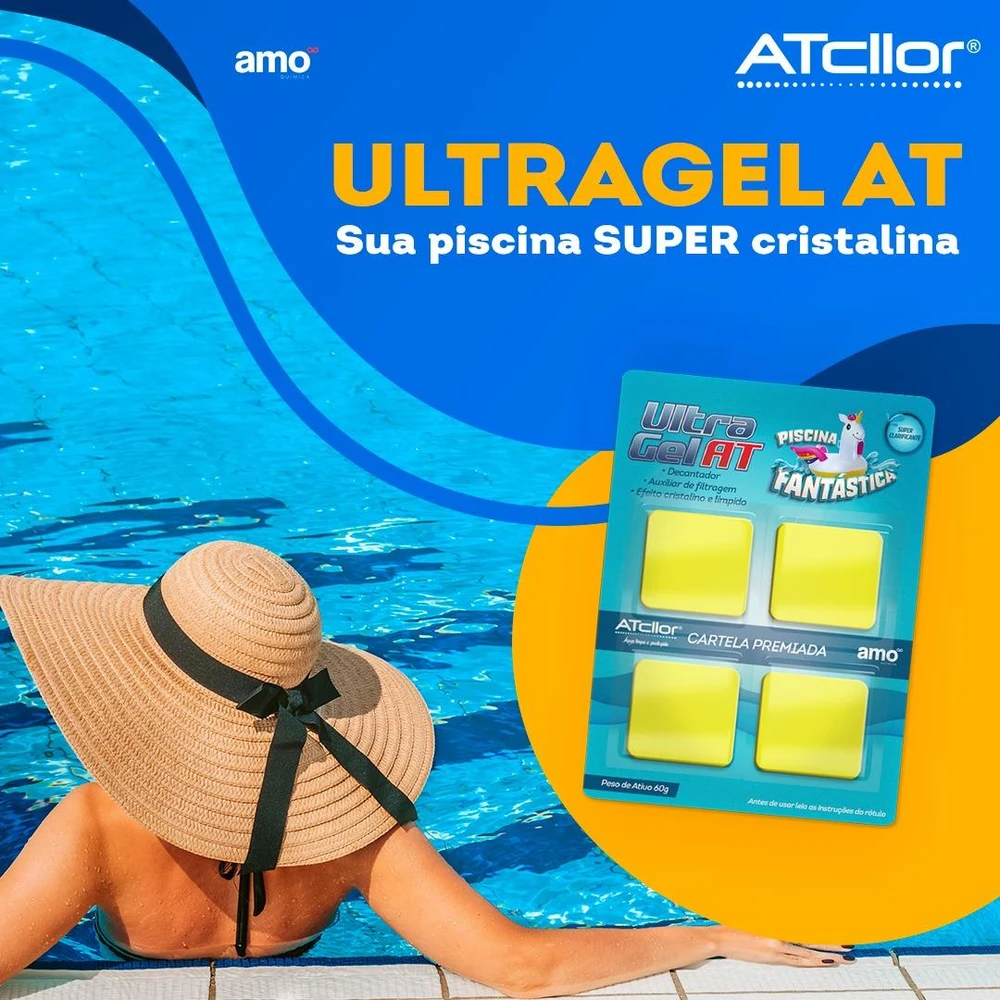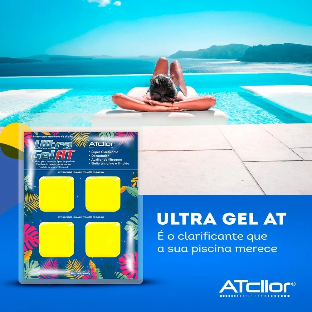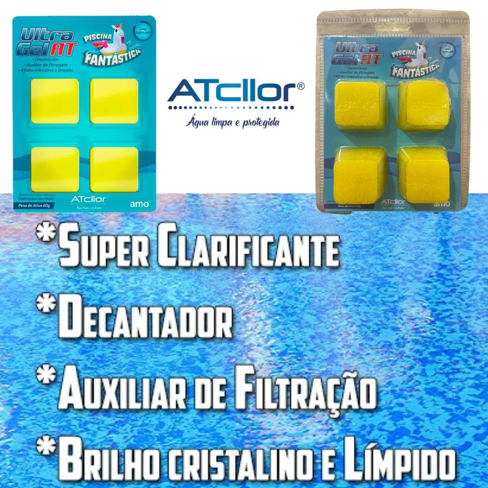 Os produtos de limpeza de piscina estão cada vez mais tecnológicos e inovadores e nossa parceira Atcllor está revolucionando o mercado com o utra gel AT que possui um super clarificante, decantador, auxiliar de filtragem e traz aquele efeito cristalina e límpido. ULTRA GEL AT elimina a turbidez da água de piscinas aglomerando rapidamente partículas que estão em suspensão, formando blocos que se decantam por serem mais pesados. Esse processo substitui o uso do sulfato de alumínio e barrilha, também aumenta a eficácia da filtração. Pois facilita a retenção das impurezas pela areia do filtro