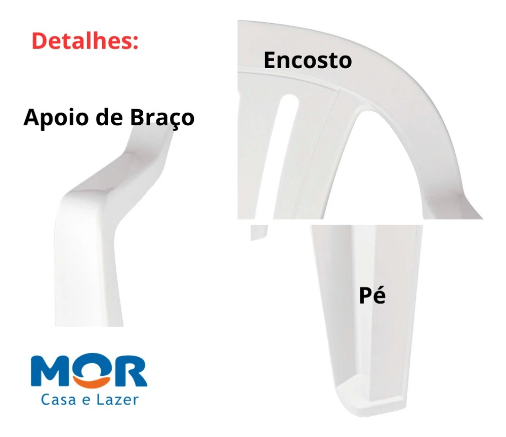 Com encosto para os braços, são confortáveis e muito leves para transportar. Também permite que sejam empilhadas, facilitando seu armazenamento. Um produto com a garantia de qualidade Mor!