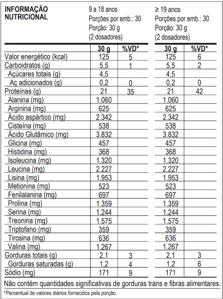 100% Whey fornece 21g de proteína , quantidade de BCAAs podendo variar de acordo com o sabor e 10g de aminoácidos essenciais em 30g de produto.