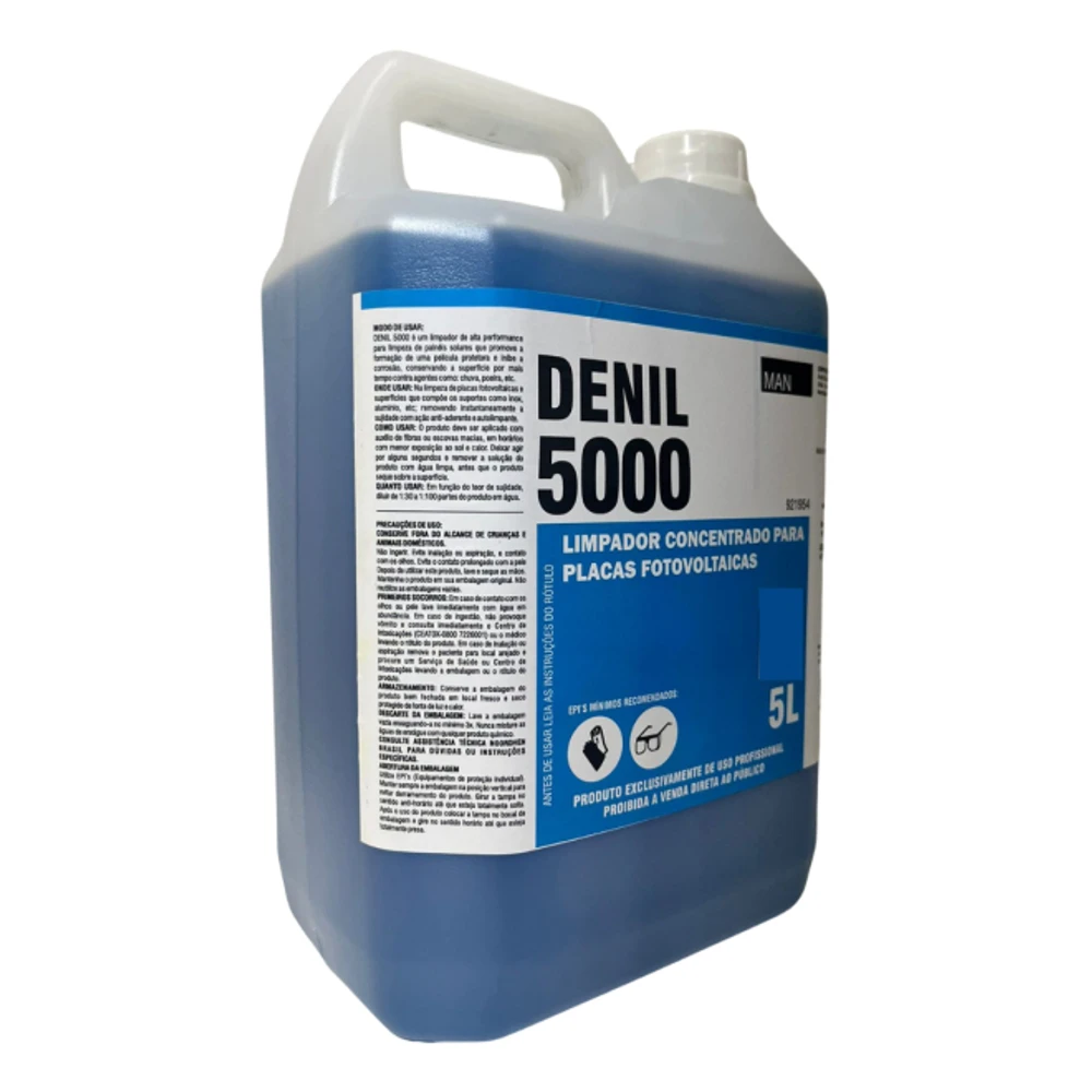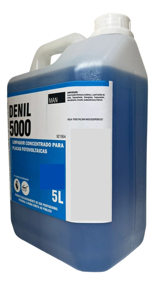 KIT FORMADO COM 02 UND GALÕES DE LIMPADOR DENIL 5000.DENIL 5000 LIMPADOR CONCENTRADO PARA PLACAS SOLARES FOTOVOLTAICASLimpador para Placa SolarDescrição:Denil 5000 é um limpador de pH neutro, biodegradável indicado para limpeza de painéis solares. Não é corrosivo e não agride a superfície nem os circuitos das placas. Possui em sua formulação uma película protetora, que facilita as limpezas posteriores e a retirada de sujidades mais difíceis.Tipos de sujidadesDiluir o produto na proporção de 1:40 (v/v), aplicar sobre a superfície que se deseja limpar com o auxílio de pulverizador ou diretamente sobre a superfície. Realizar esfregação com escovas fixas ou giratórias. Enxaguar até que todo residual saia da placa. Realizar a limpeza em temperatura amena. Aplicar fibra adequada ao tipo de sujidade e enxaguar. Deixar agir por alguns minutos antes da esfregação se necessário. Para limpeza leve e de manutenção pode-se diluir o produto até 1:100 (v/v) dependendo do grau de sujidade. Para sujidades mais pesadas pode-se diluir a partir de 1:20 (v/v). Se a limpeza não for satisfatória, dependendo do grau e tipo de sujidades presentes no sistema e do tempo que o sistema ficou sem limpeza adequada, repetir a operação ou diminuir a diluição do produto. Recomenda-se medir a geração de energia antes e depois da limpeza.Onde usar?Produto indicado para limpeza e conservação dos sistemas de geração de energia solar. Limpa sem agredir ou danificar os circuitos, aumentando o desempenho do sistema. Recomenda-se medir a geração de energia antes e depois da limpeza.Como usar?Diluir o produto na proporção de 1:40 (v/v), aplicar sobre a superfície que se deseja limpar com o auxílio de pulverizador. Realizar esfregação com escovas fixas ou giratórias. Enxaguar até que todo residual de produto seja retirado da placa. Realizar a limpeza em temperatura amena. Deixar agir por alguns minutos antes da esfregação se necessário. Para limpeza leve e de manutenção pode-se diluir o produto até 1:100 (v/v) dependendo do grau de sujidade. Para sujidades mais pesadas pode-se diluir a partir de 1:20 (v/v). Se a limpeza não for satisfatória, dependendo do grau e tipo de sujidades presentes no sistema e do tempo que o sistema ficou sem limpeza adequada, repetir a operação ou diminuir a diluição do produto. Não utilizar o produto puro ou em baixas diluições. Não deixar secar sobre as placas.