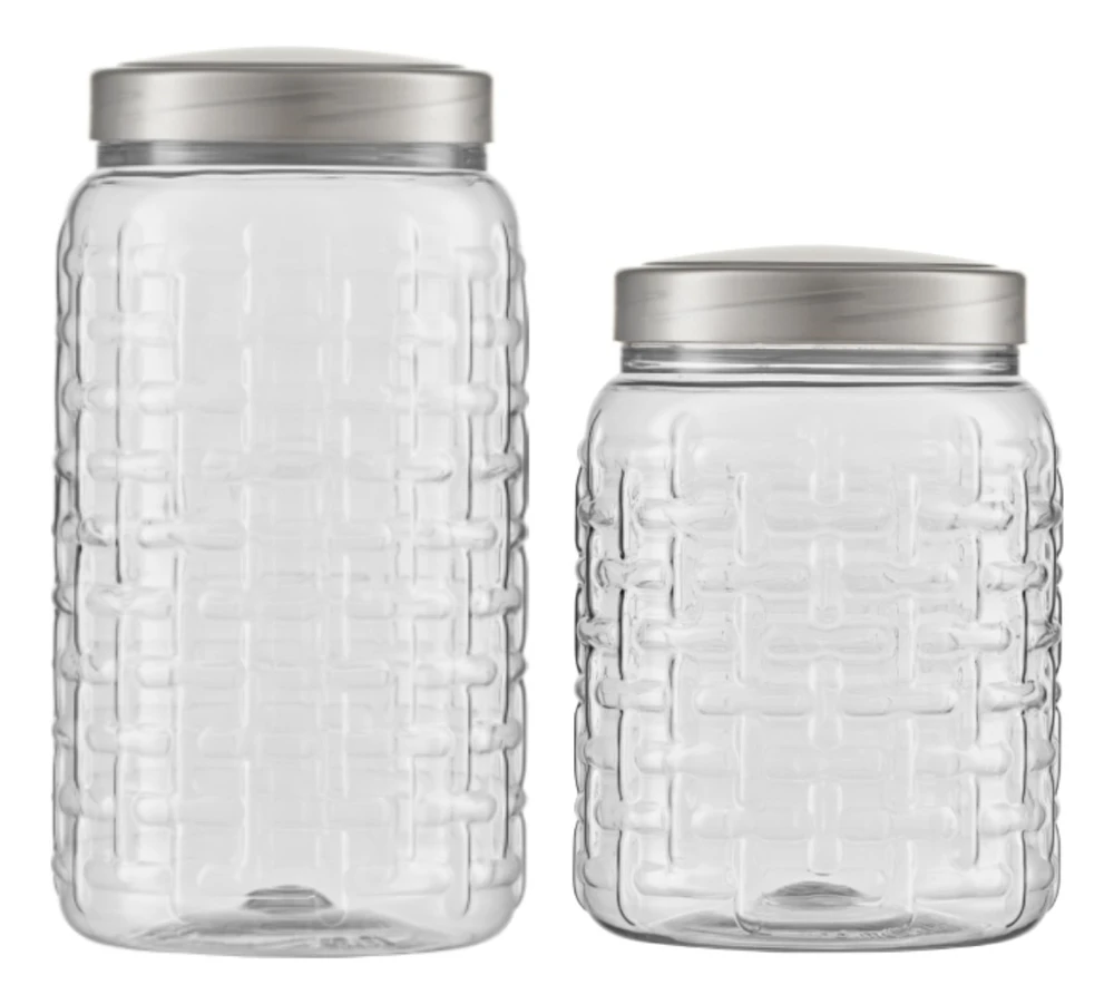 KIT 2 POTES PARA ARMAZENAR MANTIMENTOS BISCOITOS TAMPA PRATA01 UND 1,500 LT01 UND 1,000 LTSua Cozinha precisa de um desse!Perfeito para armazenar MANTIMENTOS, o Pote possui estampa moderna e exclusiva que facilita a identificação em qualquer lugar, muito prático.Possui estrutura transparente, tampa de rosquear e é desenvolvido em plástico 100% free BPA, garantindo que as biscoitos estejam sempre conservados em segurança.Simples de lavar, é necessário apenas o uso de uma esponja macia e sabão ou detergente neutros para sua limpeza, tornando sua rotina fácil e descomplicada!FICHA TÉCNICAMaterial: Plástico