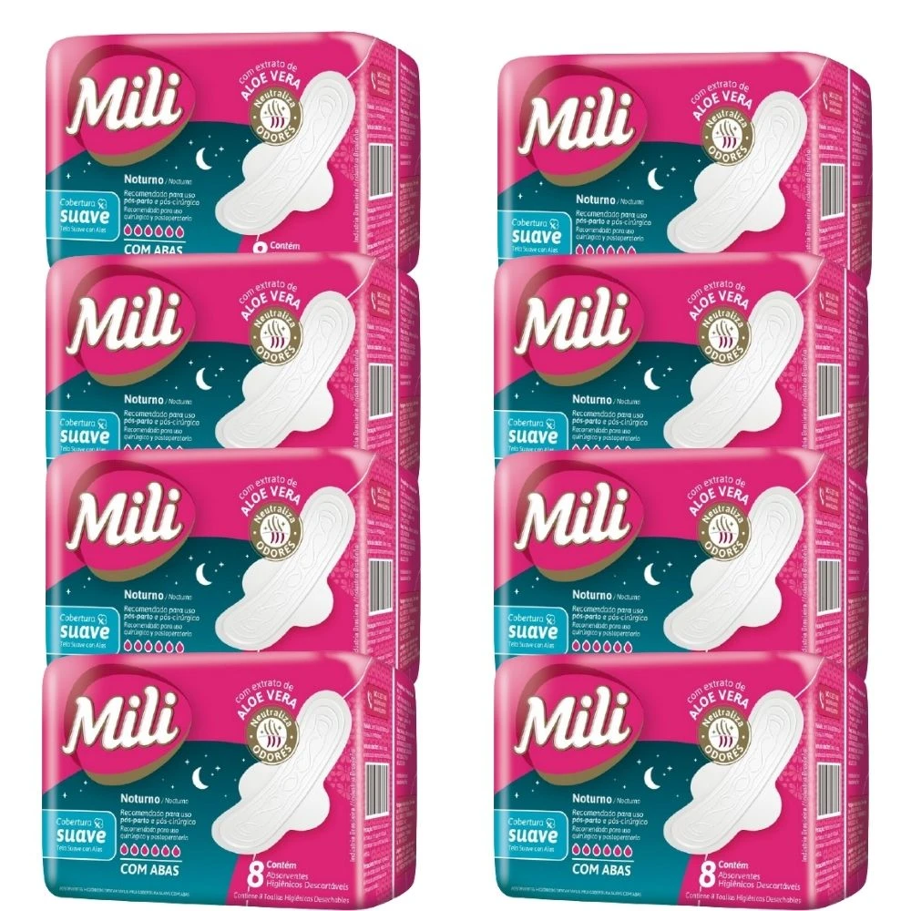 Caixa com 8 pacotes de 8 unidades cada (total: 64 absorventes).