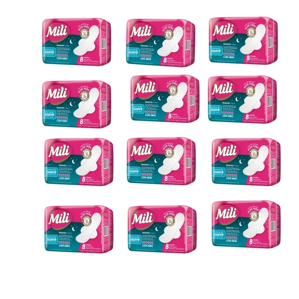 Caixa com 12 pacotes de 8 unidades cada (total: 96 absorventes).