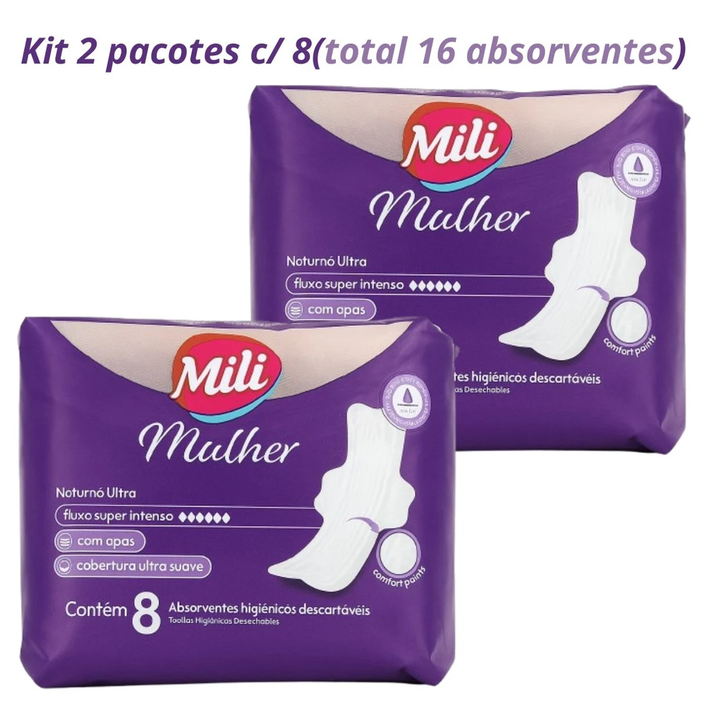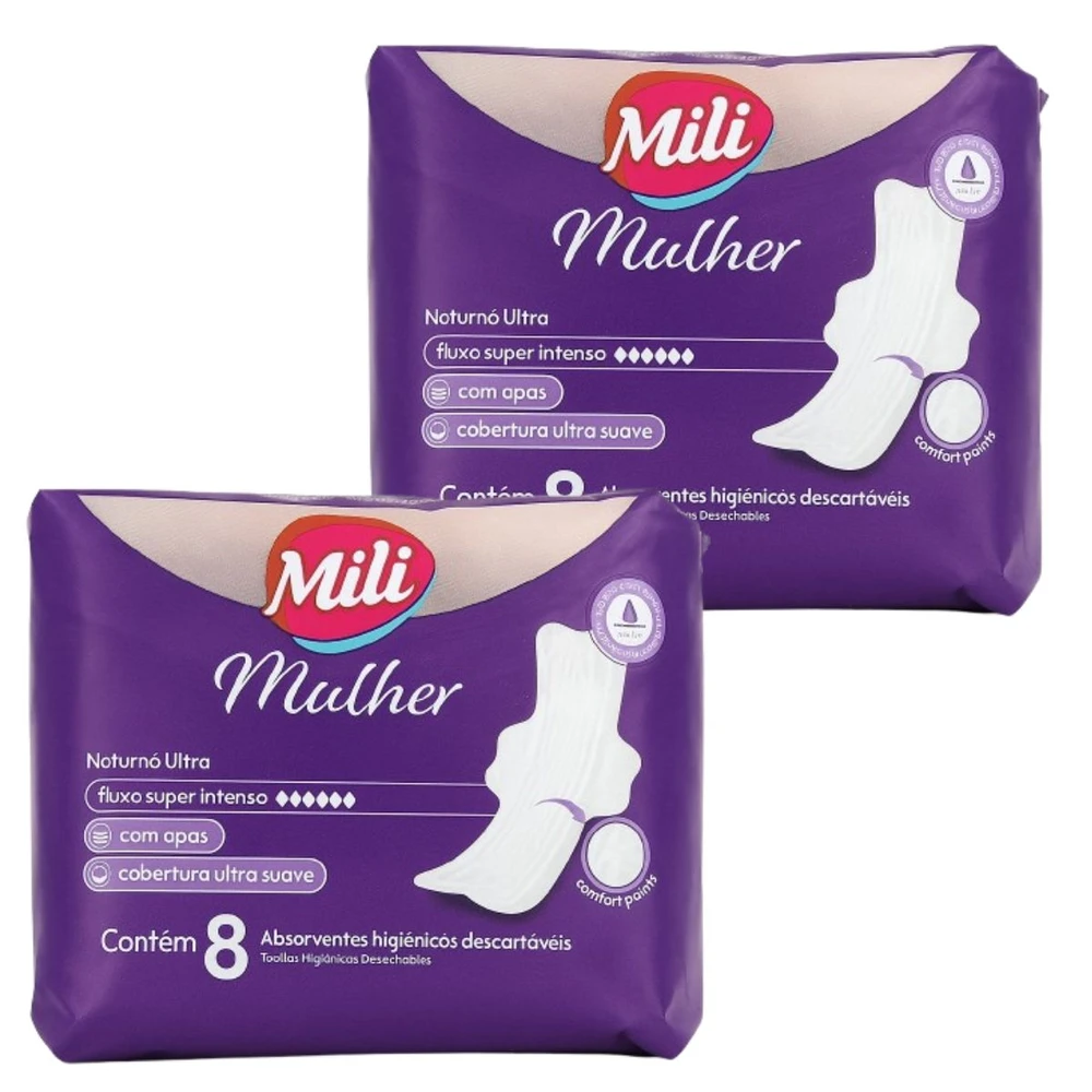 Absorvente Mili Mulher Noturno Ultra c/ abas 2 pacotes c/ 8 Unidades (total: 16 absorventes)