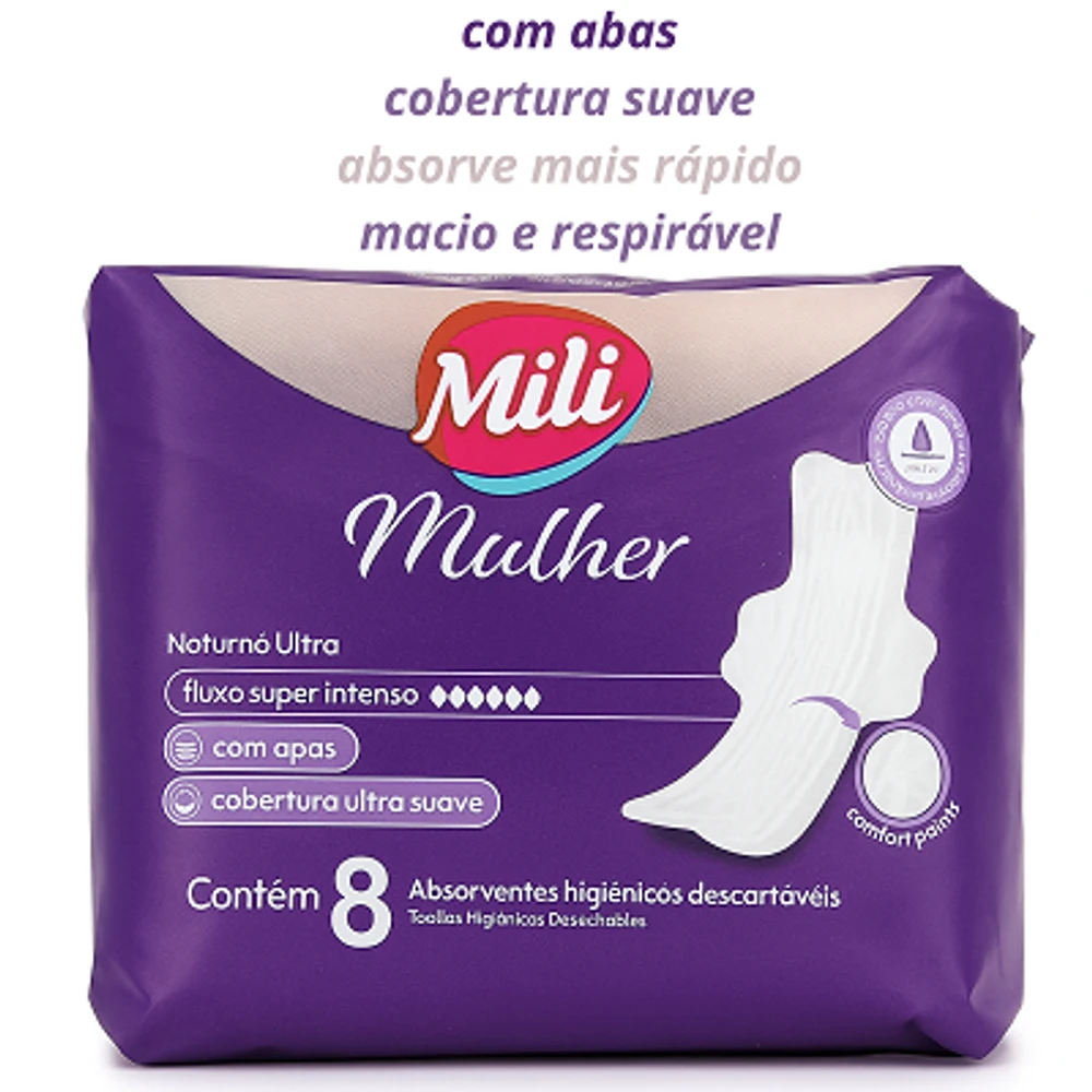 O Absorvente Mili Mulher Noturno Ultra foi desenvolvido especialmente para quem precisa de máxima proteção durante a noite ou em dias de fluxo super intenso. Com abas que mantêm o absorvente firme no lugar e uma cobertura ultra suave, ele oferece conforto incomparável e proteção duradoura.