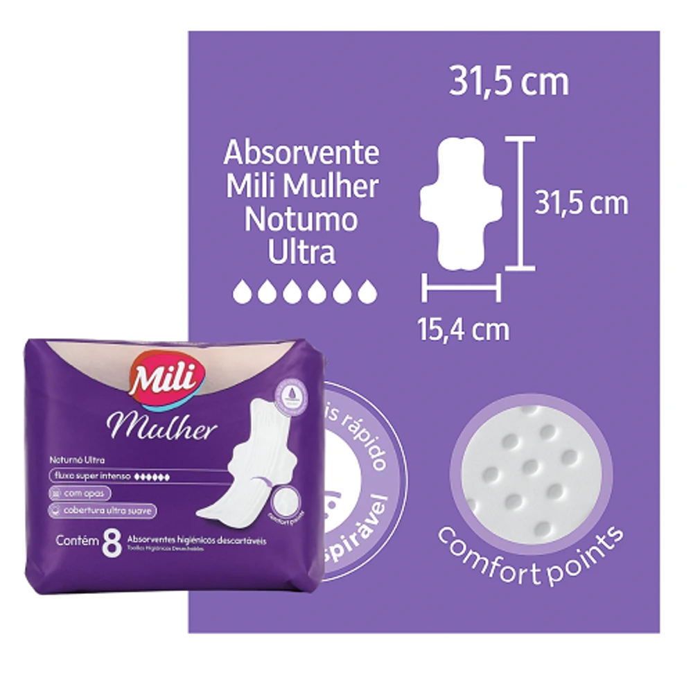 O Absorvente Mili Mulher Noturno Ultra foi desenvolvido especialmente para quem precisa de máxima proteção durante a noite ou em dias de fluxo super intenso. Com abas que mantêm o absorvente firme no lugar e uma cobertura ultra suave, ele oferece conforto incomparável e proteção duradoura.