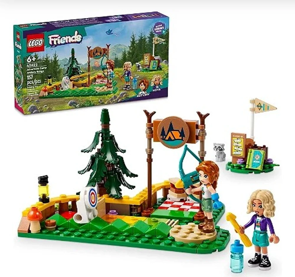 O brinquedo de construção LEGO Friends Campo de Arco e Flecha do Acampamento de Aventuras para crianças maiores de 6 anos inclui as mini bonecas da Autumn e Nova, um guaxinim e vários acessórios esportivos.