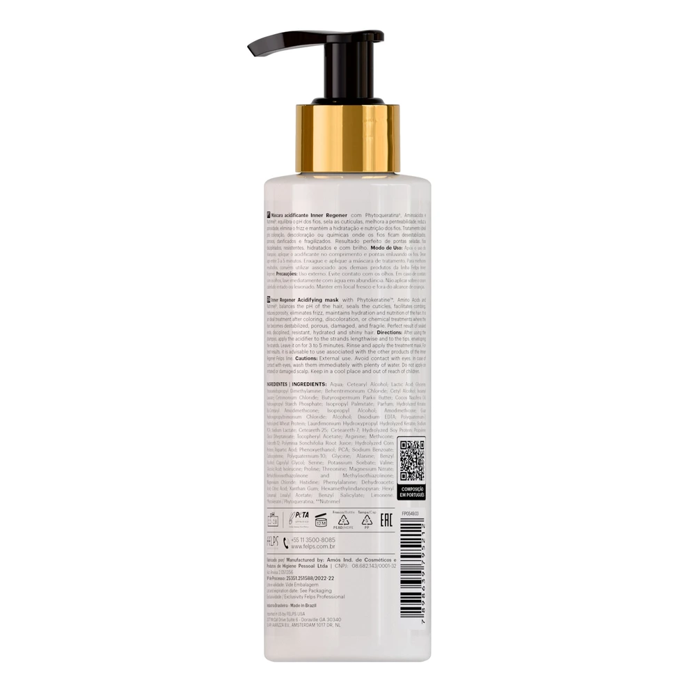 Acidificante Inner Regener com Phytoqueratina, Aminoácidos e Nutrimel, equilibra o pH dos fios, sela as cutículas, melhora a penteabilidade, reduz a porosidade, elimina o frizz, mantém a hidratação e nutrição dos fios, protege e prolonga a cor dos fios coloridos. Tratamento ideal pós coloração, descoloração ou químicas onde os fios ficam desestabilizados, porosos, danificados e fragilizados. Resultado perfeito de pontas seladas, fios disciplinados, resistentes, hidratados e com brilho.