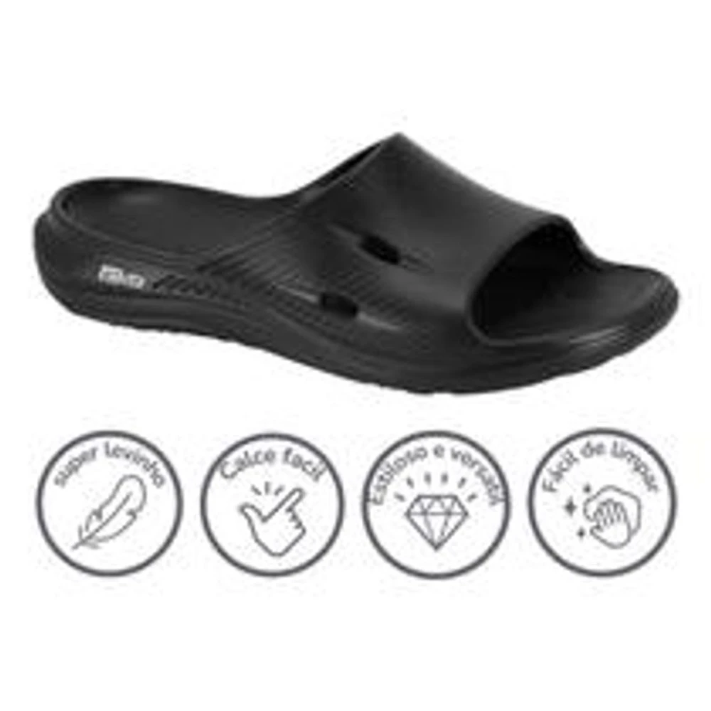 Confeccionado em EVA resistente, o chinelo garante durabilidade e uma sensação de maciez ao caminhar.