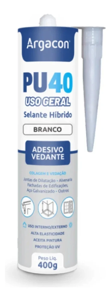 O PU 40 Branco é um selante adesivo monocomponente à base de poliuretano, pronto para uso e ideal para vedação, colagem e fixação em diversas superfícies. Desenvolvido para aplicações profissionais e domésticas, garante vedação sem bolhas, excelente acabamento e máxima resistência! Com fórmula de alta qualidade, o PU 40 proporciona adesão segura, até mesmo em superfícies úmidas, e pode ser utilizado em diversas áreas da construção civil, industrial e residencial. Principais Benefícios: - Alto poder de adesão em superfícies lisas ou porosas - Selante + Cola multifuncional - Resistente à chuva, vento e variações climáticas - Aplicável em superfícies úmidas - Aceita pintura (tintas à base d’água) - Alta durabilidade e resistência química - Textura firme e fácil de aplicar com pistola - Não forma bolhas durante a aplicação - Secagem eficiente: forma película entre 20 a 30 minutos Indicado para aplicação em: Mármore, granito, pedras naturais - Concreto, cimento, telhas - Madeira, vidro, alumínio, metais - Banheiras, cubas, bacias, pias, acrílicos - Vedações em ambientes internos e externos Conteúdo do Kit: 1 Cartucho de PU 40 Branco com 400g 1 Bico aplicadores original Informações Técnicas: - Marca: Argacom - Peso: 400g por cartucho - Medidas: 21,5 cm (altura) x 4,6 cm (diâmetro) - Composição: Poliuretano com silano modificado, aditivos e cargas minerais - Validade: Conforme embalagem Modo de Uso: - Limpe bem a superfície antes da aplicação - Corte a ponta do cartucho e encaixe o bico - Use uma pistola aplicadora de selante - Aplique em filete contínuo e uniforme - Faça o acabamento antes da secagem superficial (20-30min) - Cura total em até 72 horas - Armazenamento Correto - Manter em local fresco e seco (entre 5°C a 30°C) - Após aberto, manter o bico com uma gota de produto - Validade de até 3 meses após aberto