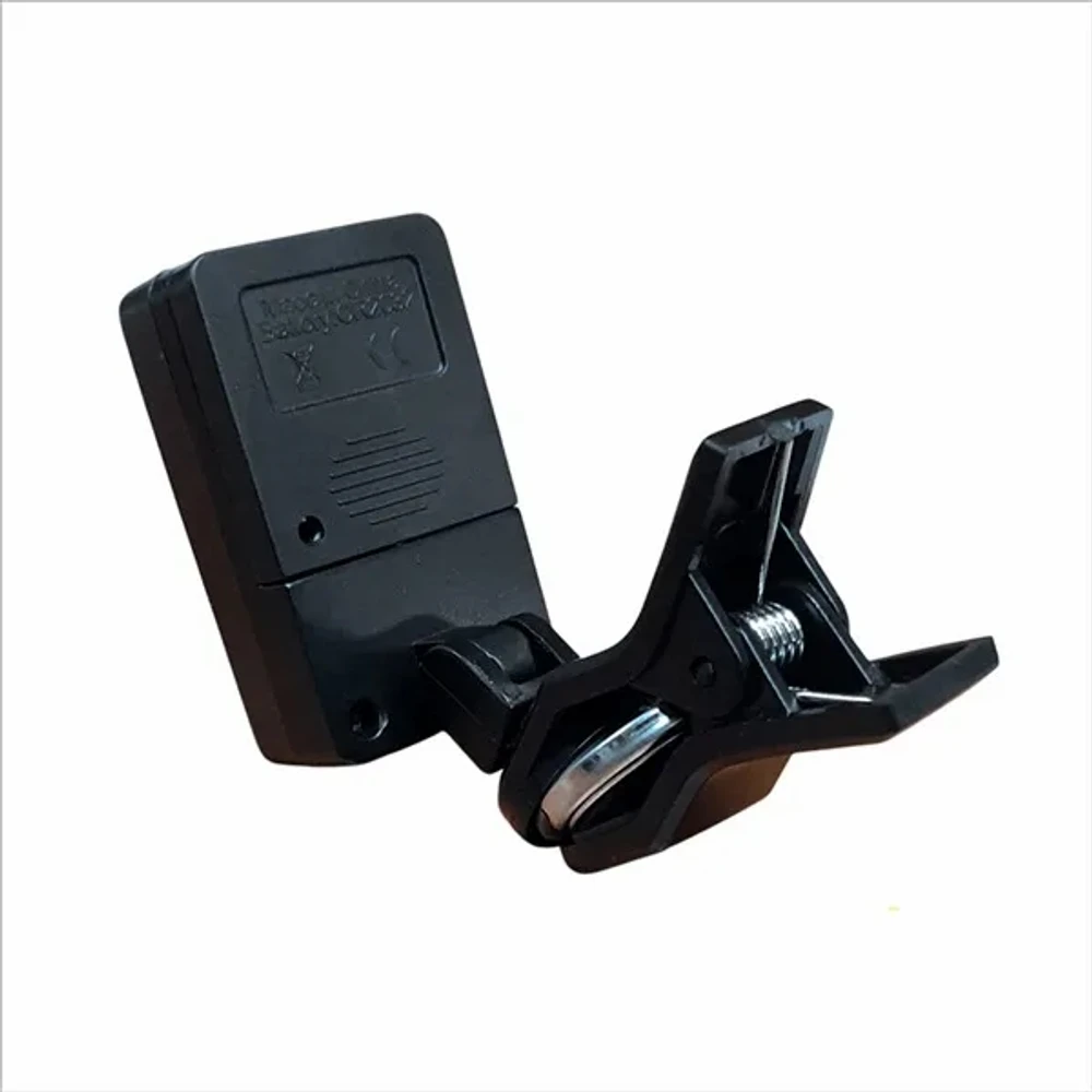 Acabamento em plástico preto com corpo compacto e “garras” acolchoadas no clip para fixação sem danificar o instrumento. Visor central e botões de controle discretos.