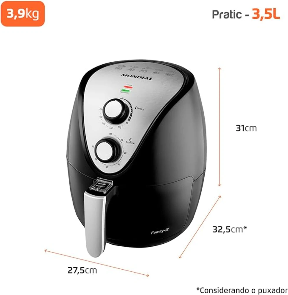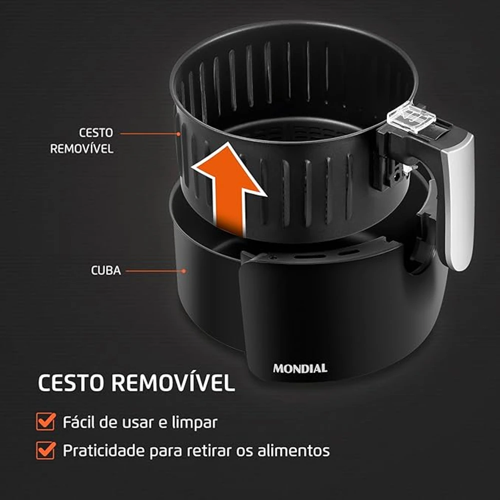 A Air Fryer Mondial AF-30i é a opção perfeita se você quer acrescentar praticidade e saúde na sua rotina diária. A tecnologia de Circulação de Ar Quente cozinha, frita (a ar), assa ou tosta os alimentos sem precisar adicionar óleo ou manteiga. Além disso, a alta potência proporciona rapidez no preparo das receitas. A Air Fryer tem capacidade de 3,5 litros e o cesto é revestido com antiaderente Duraflon, tecnologia exclusiva Mondial.