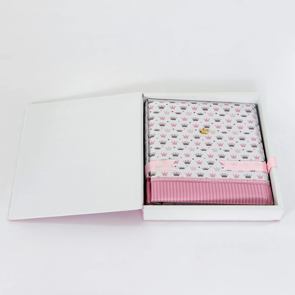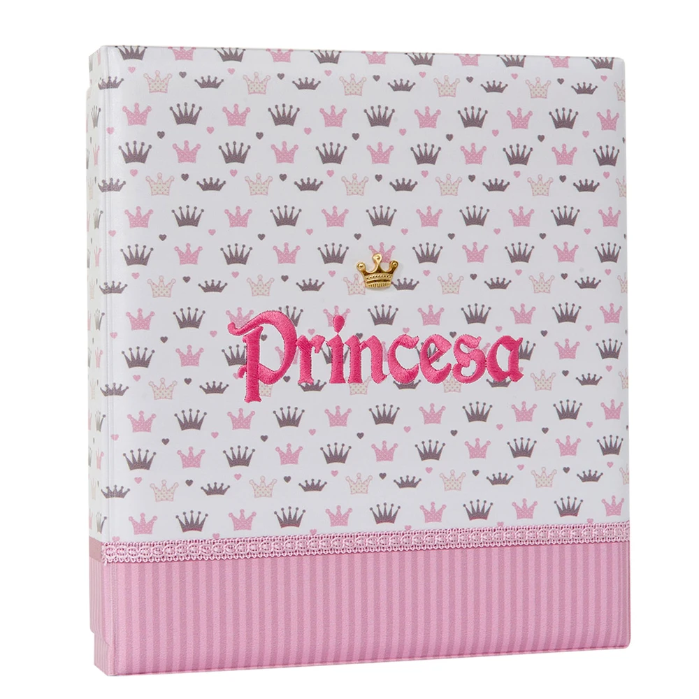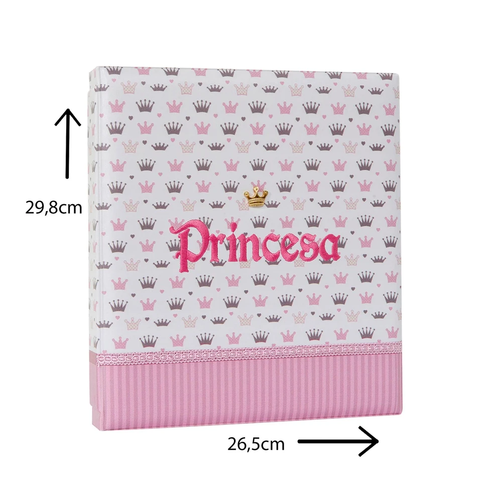 O álbum bordado acompanha folhas de diário do bebê para você registrar os melhores momentos.
