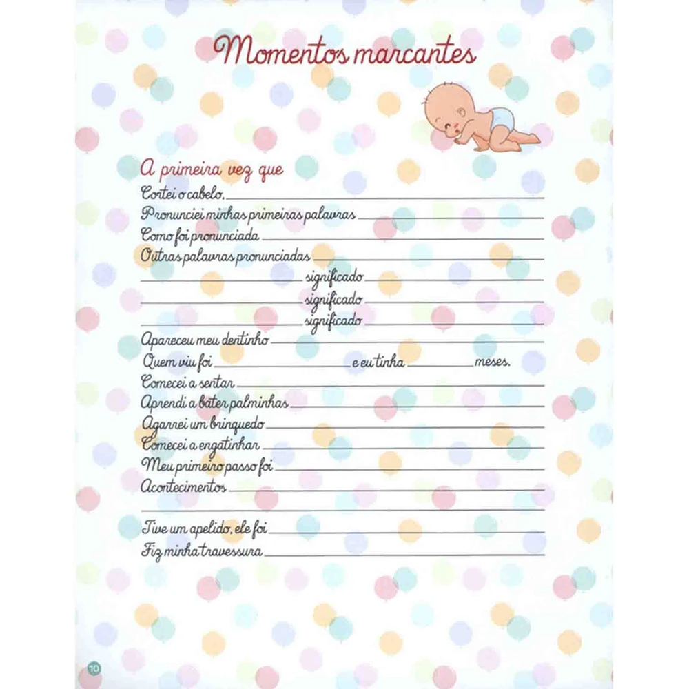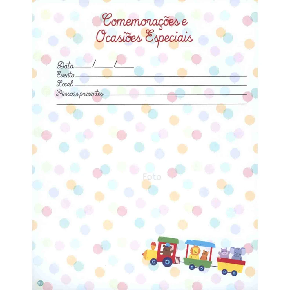 O álbum acompanha folhas de diário do bebê para você registrar os melhores momentos.