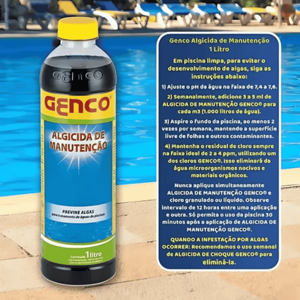 O ALGICIDA DE MANUTENÇÃO GENCO previne o desenvolvimento de algas em águas de piscinas. Algas são organismos microscópicos que se desenvolvem na presença de água e luz solar, podendo tornar a água da piscina verde e turva, com pisos e paredes escorregadias. A infestação de algas geralmente acontece no verão, após chuvas intensas, quando os residuais de cloro estão abaixo do nível recomendado. A fórmula foi desenvolvida especialmente para prevenir o desenvolvimento de algas.
