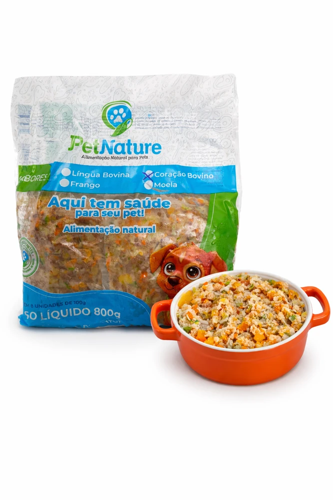 Composição Básica do Produto: Coração bovino, Fígado Bovino, Batata Doce, Arroz parboilizado, Cenoura, chuchu, abobrinha, jerimum, Óleo Vegetal, Sal, carbonato de cálcio, carbonato de potássio, cloreto de sódio, fosfato bicálcio, DL-metionina, L-taurina, L-triptofano, biotina, cloreto de colina, niacina, pantotenato de cálcio, vitamina A, vitamina B1, vitamina B12, vitamina B2, vitamina B6, vitamina C, vitamina D3, vitamina E, vitamina K3, ácido fólico, cobre quelato, iodato de cálcio, proteinato de selênio, proteinato de ferro, sulfato de magnésio, sulfato de manganês, sulfato de zinco, dioxido de silício, tocoferol.