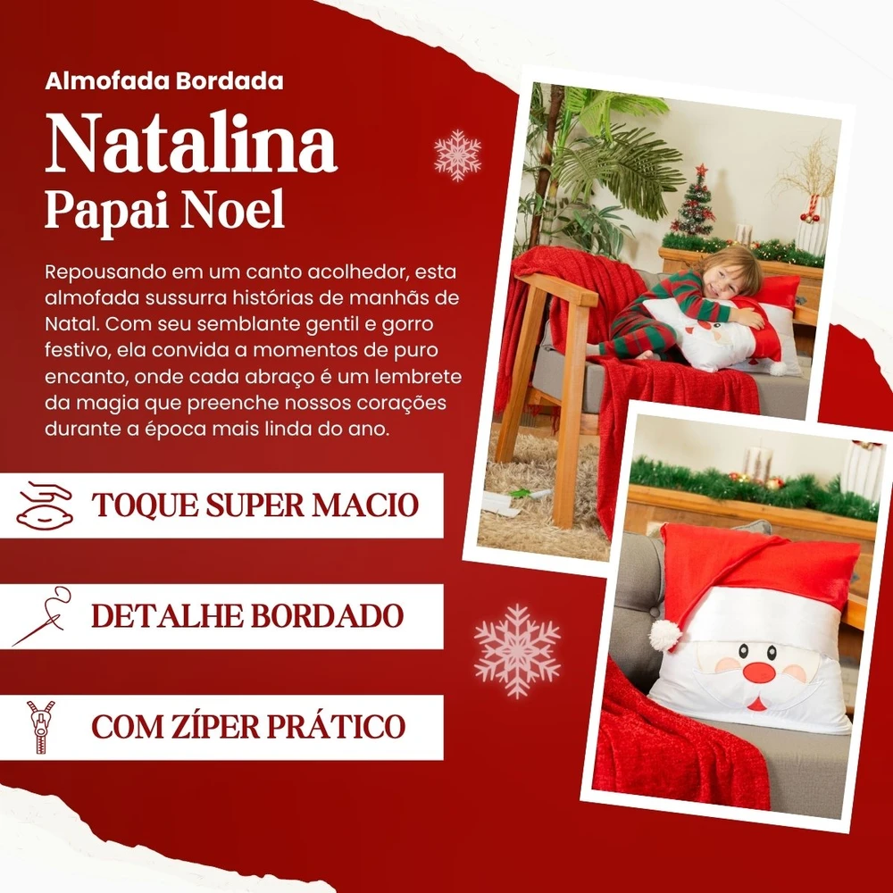 Esta almofada natalina avulsa, medindo 45cm x 45cm, é ideal para a sua decoração de Natal e decoração de Fim de Ano. Ela se destaca pelo seu encantador Papai Noel bordado, um elemento essencial para criar um ambiente festivo. O tecido da almofada é em microfibra 100% poliéster, oferecendo um toque suave e resistência. O gorro do Papai Noel é confeccionado em cetim brilhante, adicionando um charme especial. Para garantir o máximo conforto, a almofada possui enchimento em refil de silicone, mantendo a peça sempre fofa e aconchegante. Confira!
