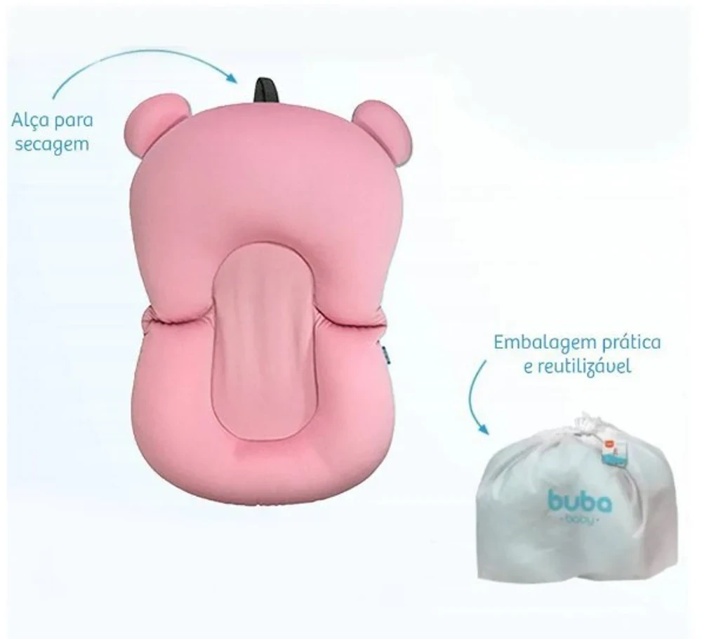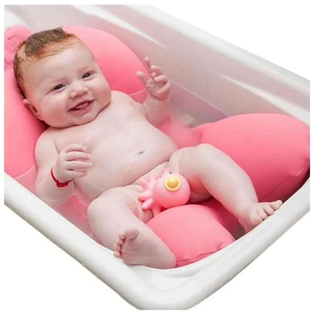 A almofada de banho evita que o bebê escorregue e dá suporte para a mamãe