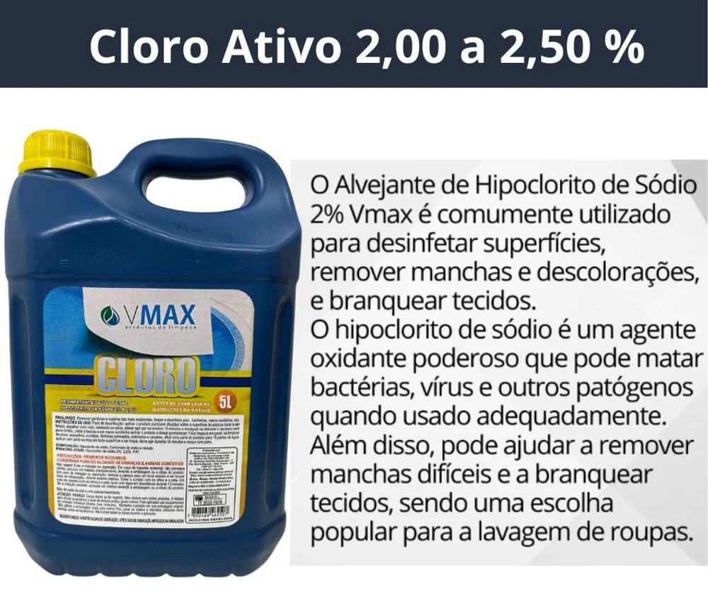 O Alvejante de Hipoclorito de Sódio 2% Vmax é comumente utilizado para desinfetar superfícies, remover manchas e descolorações, e branquear tecidos. O hipoclorito de sódio é um agente oxidante poderoso que pode matar bactérias, vírus e outros patógenos quando usado adequadamente. Além disso, pode ajudar a remover manchas difíceis e a branquear tecidos, sendo uma escolha popular para a lavagem de roupas.
