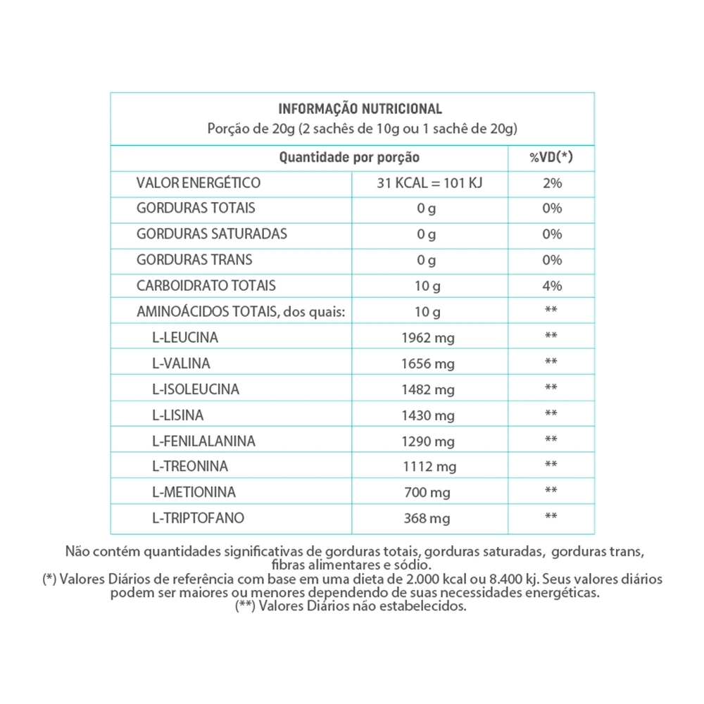 Aminoácidos incluídos na fórmula: leucina, valina, triptofano, isoleucina, lisina, metionina, treonina e fenilalanina.