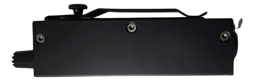 Ergonomia: formato retangular estreito (bodypack), com botão rotativo de fácil acesso na face superior; clipe traseiro para fixação em cinto.