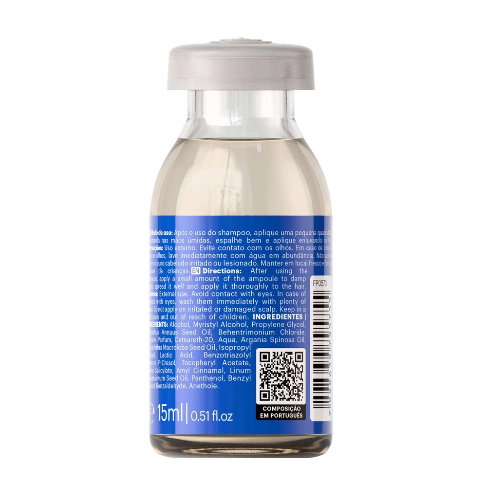 Modo de uso: Após o uso do shampoo, aplique uma pequena quantidade da ampola nas mãos úmidas, espalhe bem e aplique enluvando os fios.