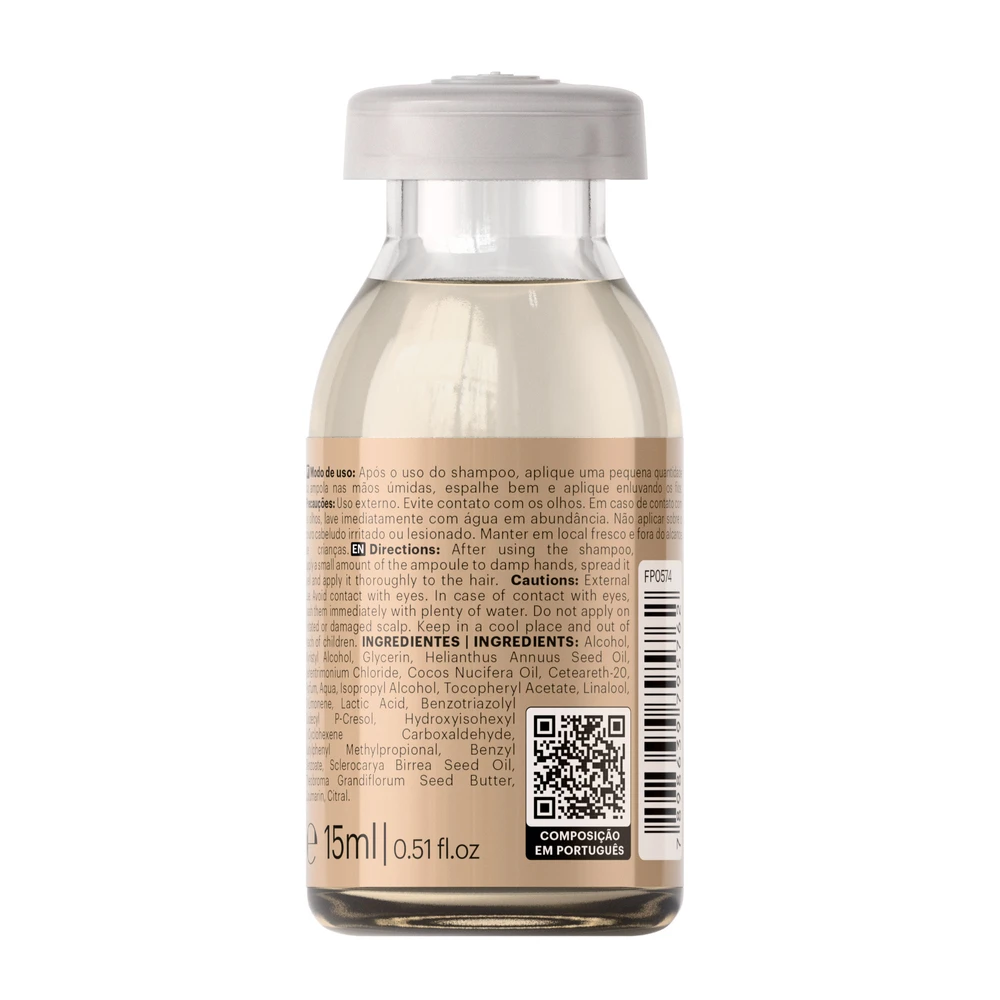 Após o uso do shampoo, aplique uma pequena quantidade da ampola nas mãos úmidas, espalhe bem e aplique enluvando os fios.