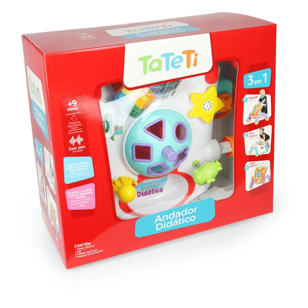 Para estimular os primeiros passinhos com muita diversão e aprendizado! O Andador Didático Tateti é um brinquedo 3 em 1: pode ser utilizado como mesinha, painel de atividades ou andador, acompanhando cada fase do desenvolvimento do bebê. Estimula a coordenação motora, promove o desenvolvimento cognitivo e introduz noções de cores, formas e tamanhos. Possui peças didáticas para encaixar, elementos com movimento, esfera giratória com barulhinho e espaço para guardar as pecinhas. Um brinquedo completo que desperta a curiosidade e incentiva a descoberta por meio da interação e do som.