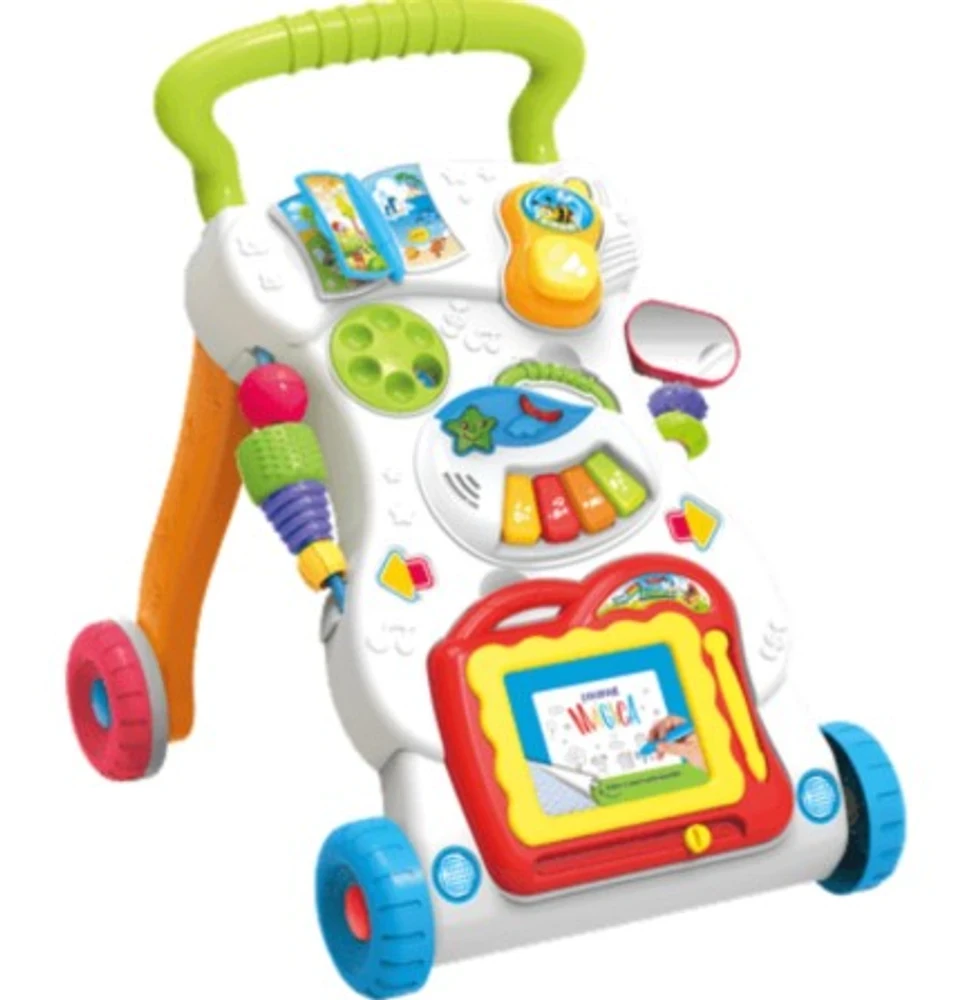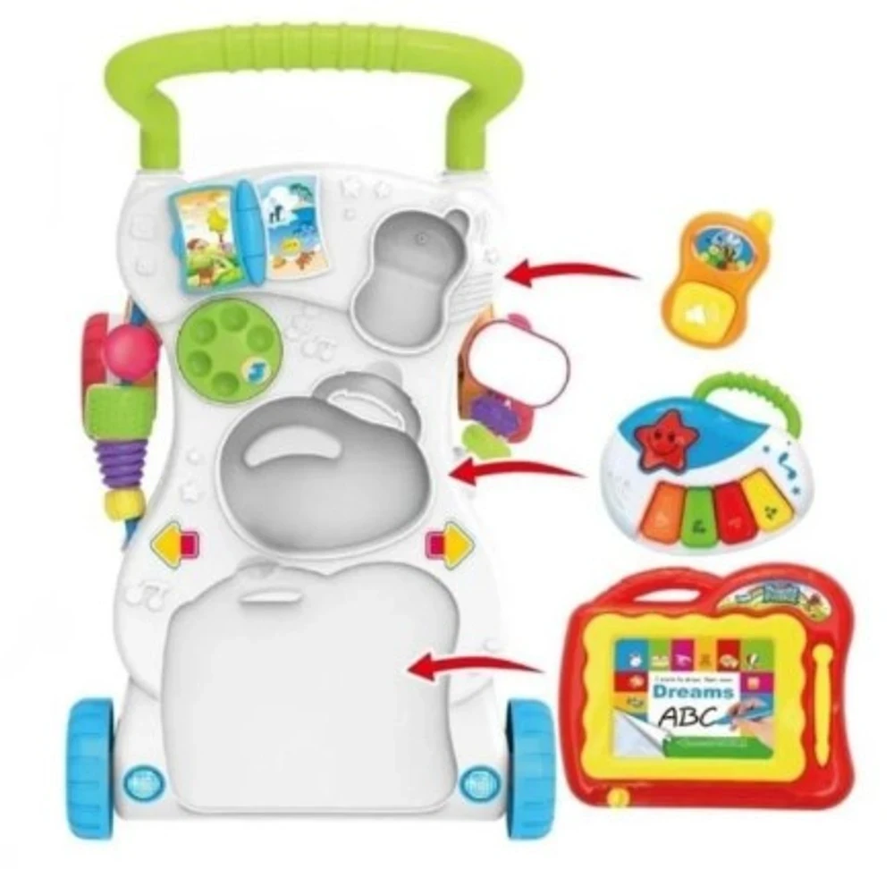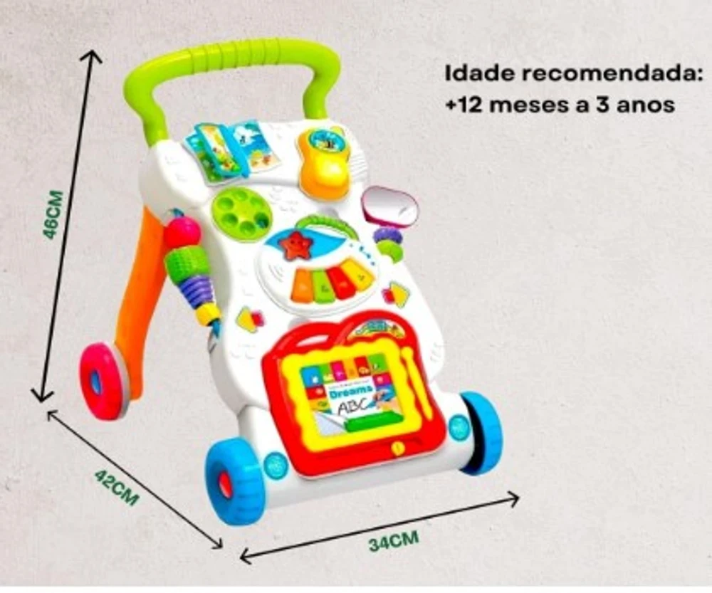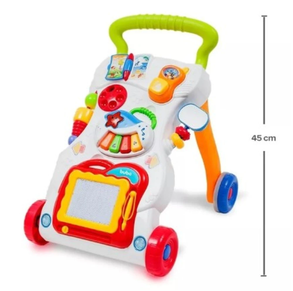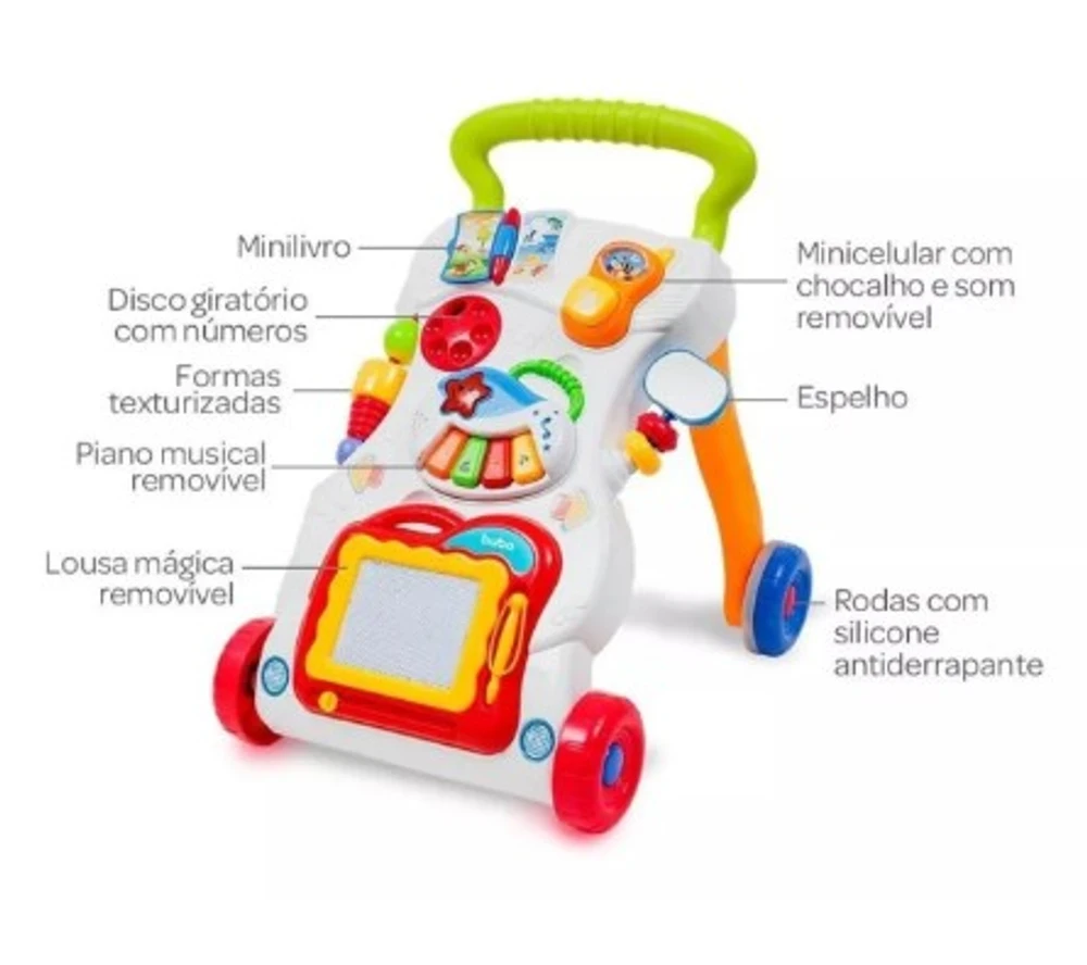 Com diversas possibilidades de brincar, entretém e desenvolve os sentidos do bebê. Sentado ele pode desenhar na lousinha, virar as páginas do livrinho, discar e tocar piano.