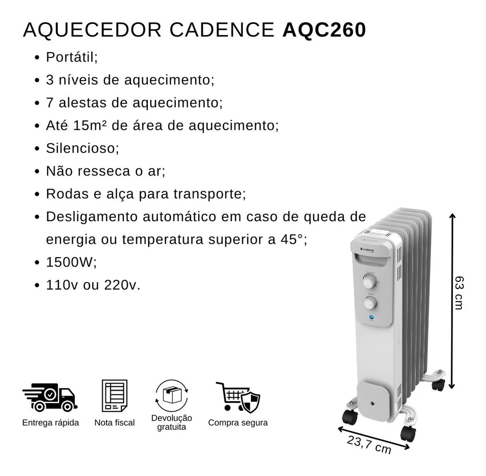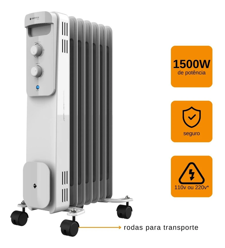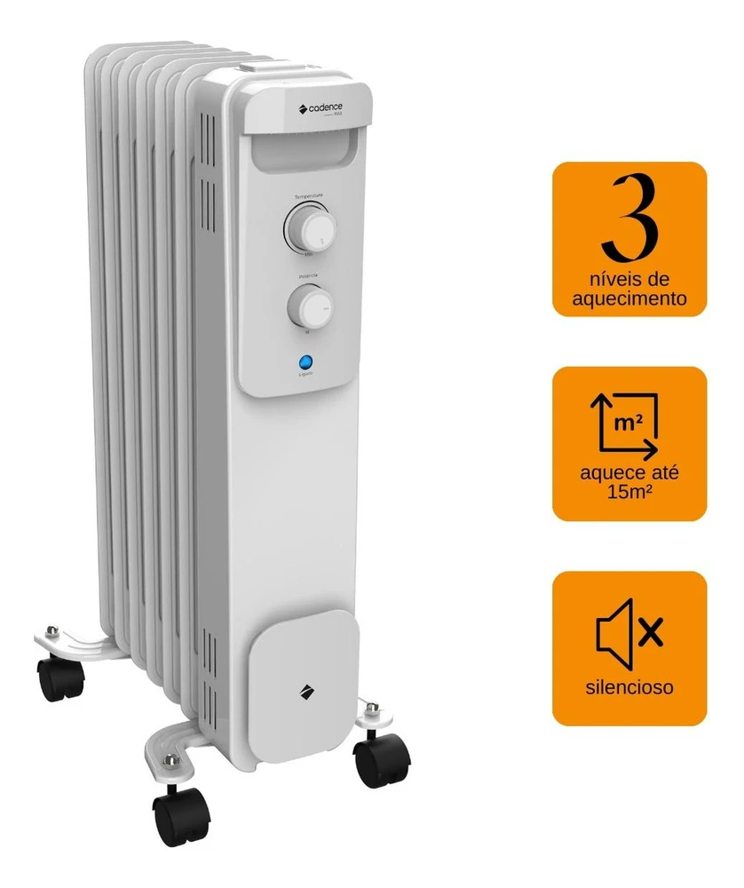 Com o Aquecedor a Óleo Max Cadence é fácil e bem econômico.Por ser a óleo, ele consome muito menos energia, não resseca o ar e é supereficiente, aquecendo até 15 m². E com esse design moderno e cheio de tecnologia vai ficar lindo no seu quarto. Ou na sua sala. Ou na cozinha. Ainda bem que ele já vem com rodinhas, né? Surpreenda-se com a qualidade desse produto e faça bom proveito.