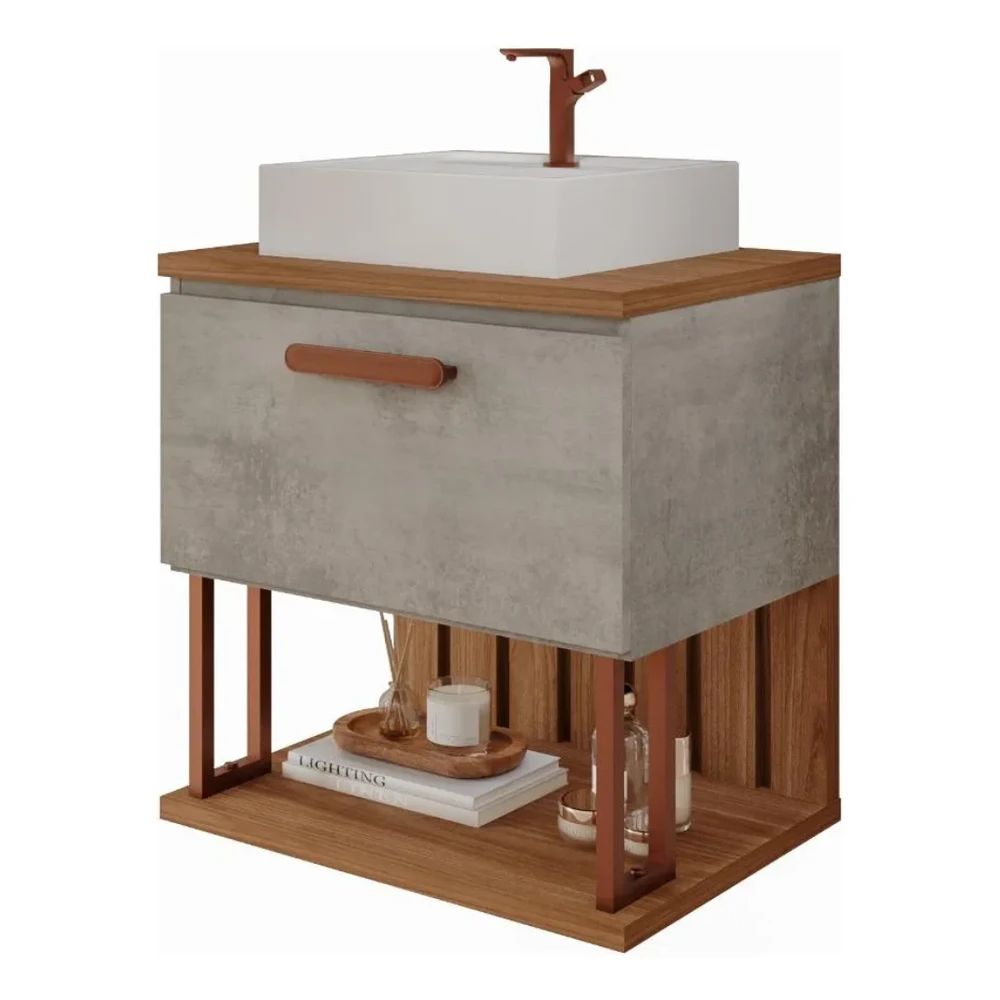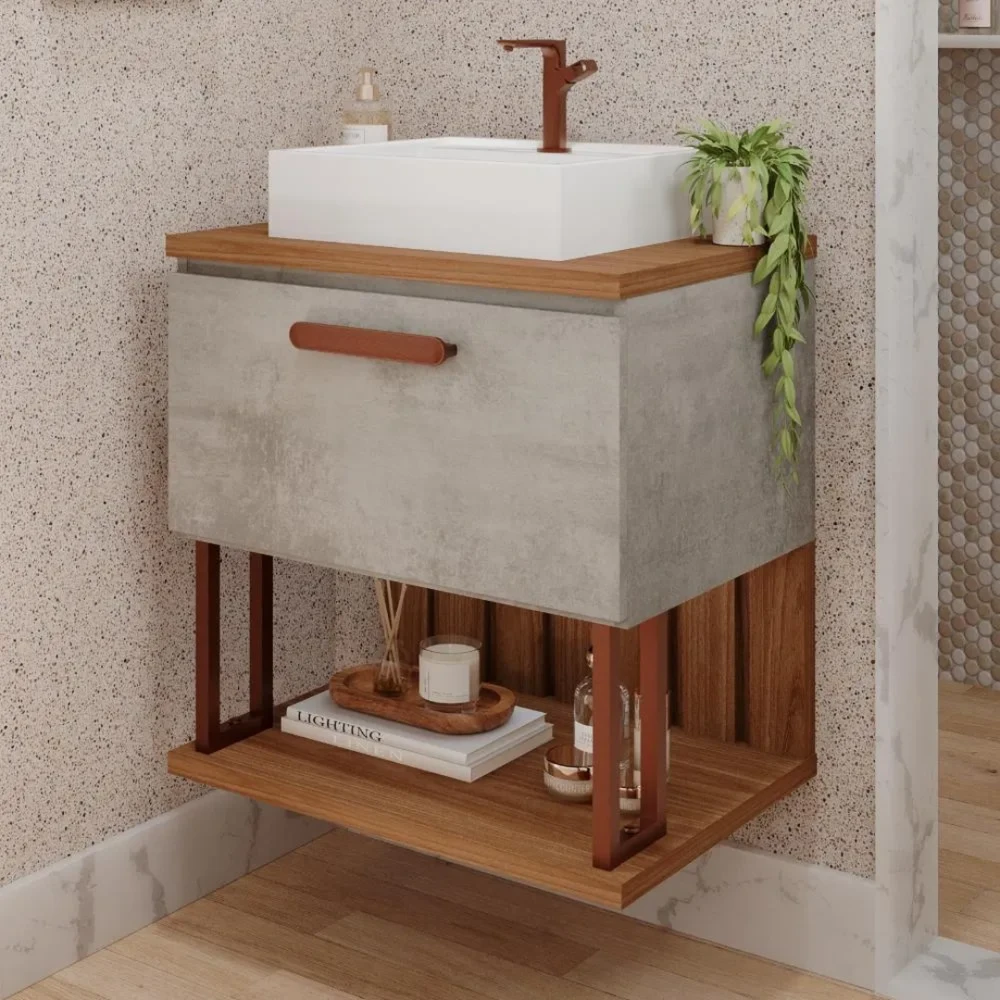 Renove o seu banheiro com o Gabinete Duna da MGM Móveis! Com 1 porta com fechamento suave por meio de pistão a gás e 1 pia integrada, combina funcionalidade e estilo. Construído em MDF com a combinação de cores Cinza Cimento e Marrom Freijó, este gabinete adiciona um toque contemporâneo ao ambiente. Seu acabamento em pintura UV assegura durabilidade e elegância. Melhore o visual do seu banheiro com o Gabinete Duna, criando um espaço prático e visualmente atrativo. Aproveite! Especificações: - Comprimento: 61,3 cm - Largura: 45,1 cm - Altura: 73,0 cm - 1 Porta com Pistão a Gás - 1 Prateleira - Material: 100% MDF - Acabamento: Pintura UV - Acompanha Pia/Lavatório em Mármore Sintético - Cor: CIMENTO/FREIJÓ IMPORTANTE: NÃO ACOMPANHA TORNEIRA - As configurações do seu monitor ou dispositivo móvel podem afetar a tonalidade da cor do produto. Conferir na descrição. - Recomendação de Limpeza: Limpar com pano seco para retirar o pó. Não aplicar produtos abrasivos. - Produtos de Enfeite e Eletrônicos Não Estão Inclusos.