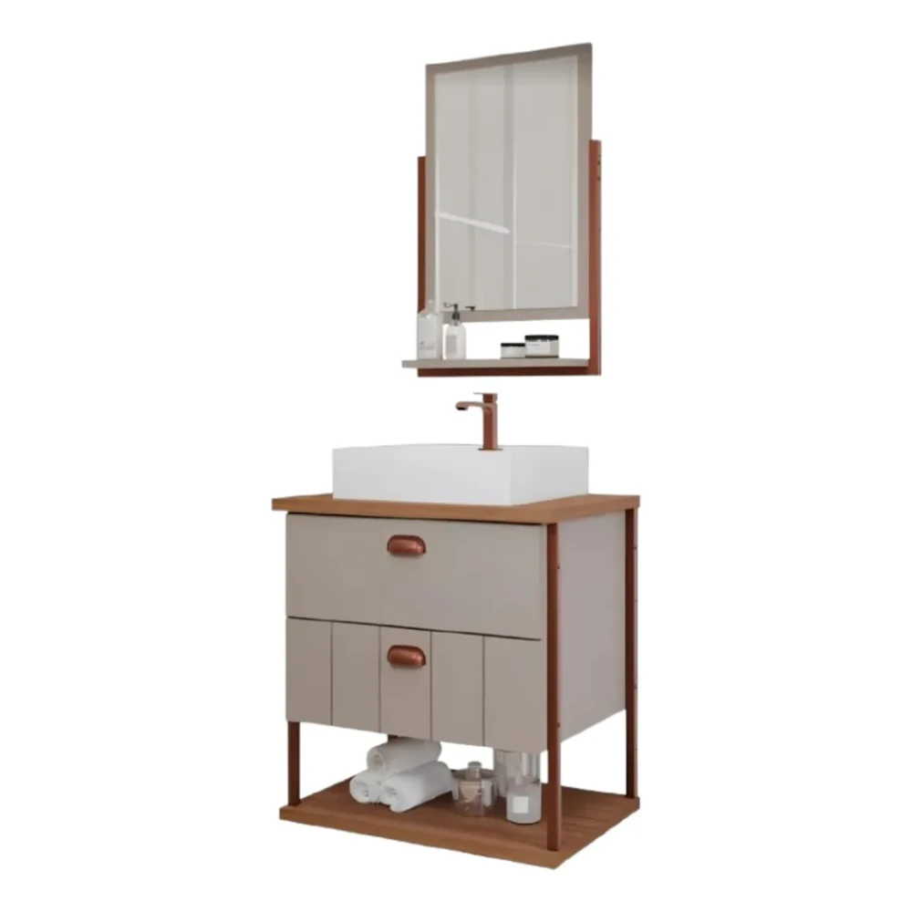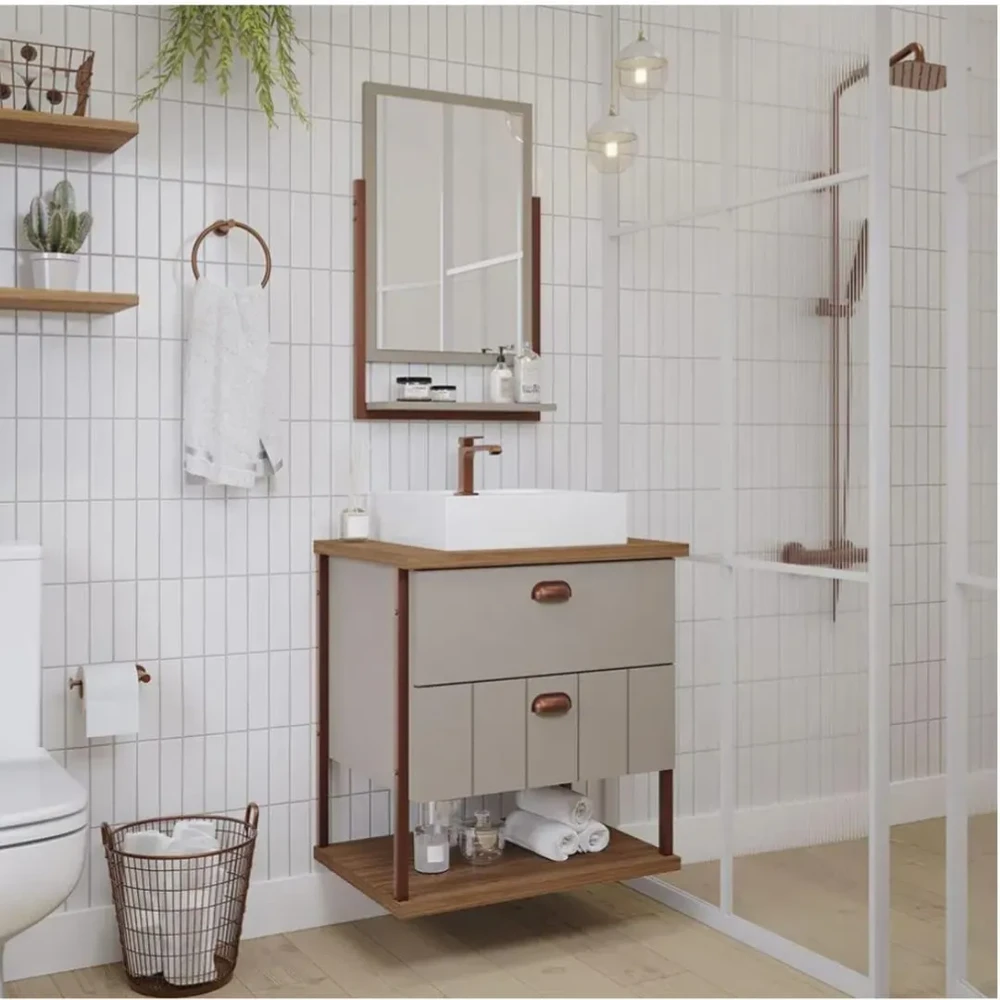 ARMÁRIO COM ESPELHEIRA UNI 60CM - COR CAPUCCINO/FREIJÓ - MGM DESCRIÇÃO DO PRODUTO: Armário suspenso para banheiro, com duas gavetas e 1 prateleira, puxadores em abs pintado, estrutura 100% MDF, amplo espaço interno, lavatório 100% mármore sintético com mais durabilidade e resistência. CARACTERÍSTICAS: Ideal para banheiros, proporcionando um espaço organizado e funcional em sua casa ou empresa; Versatilidade e Organização; Matéria-prima e acabamento de qualidade; Designer moderno e sofisticado; Abertura e fechamento por puxador em couro sintético. ESPECIFICAÇÕES TÉCNICAS: Marca: MGM Móveis; Origem do Produto: Nacional; Modelo: Uni; Cor: Cappuccino/Freijó [as imagens são meramente ilustrativas, podendo variar a tonalidade em até 15% de acordo com o lote e a maneira do direcionamento da luz sobre o produto]; Itens INCLUSOS: 1 Cuba de Mármore Sintético, 1 Armário em MDF com puxadores em abs pintado, espelho com prateleira. Itens NÃO INCLUSOS: Não estão inclusos torneira e acessórios como: válvula, sifão e engate. Orientação para Instalação: Atenção às medidas e ao espaçamento, orientamos que faça as medições antes de adquirir o Armário Uni 60cm. A cuba de mármore sintético possui um furo vazado, tamanho padrão. Sistema de Abertura: Por Puxador em abs pintado; Sistema de Fechamento: Por Puxador em abs pintado; Acompanha Manual de Instalação: Sim.