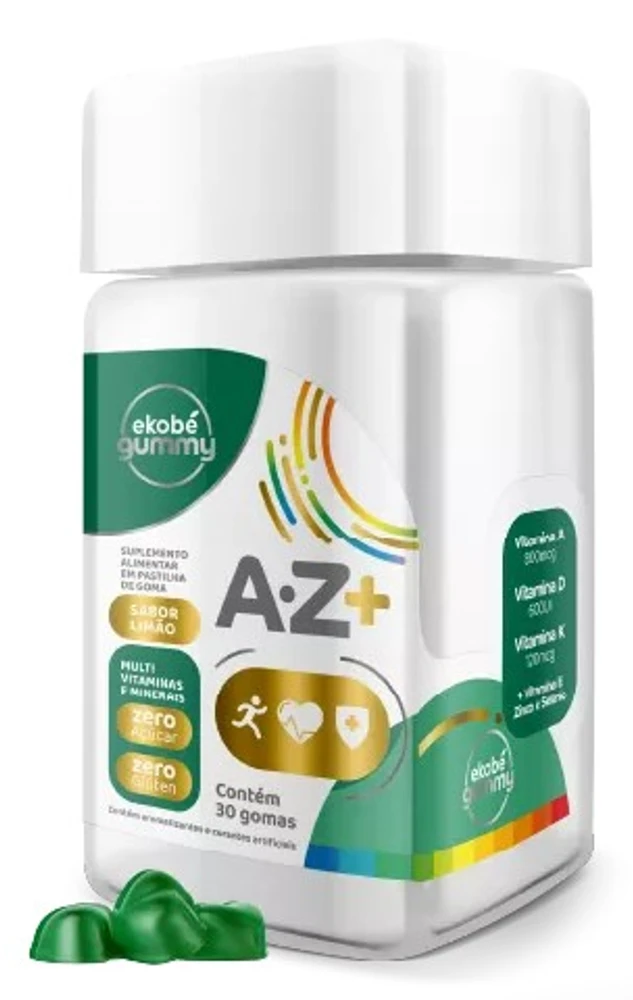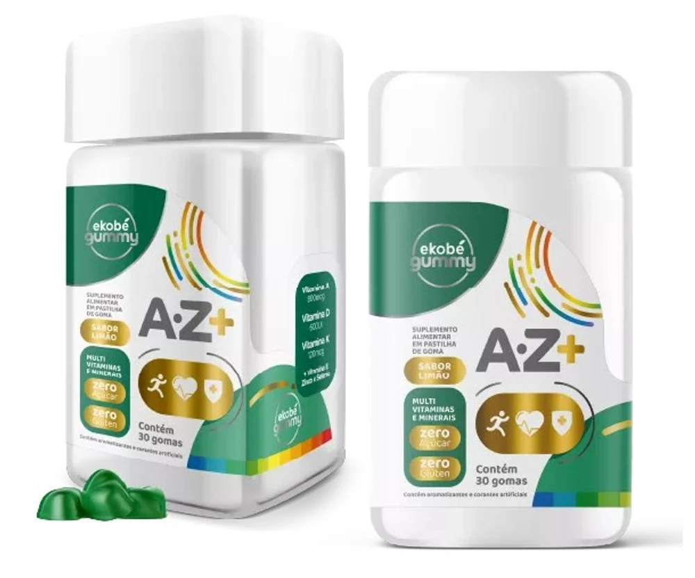 Bisglicinato de zinco, acetato de DL-alfa-tocoferol (vitamina E), nicotinamida (niacina), bisglicinato de manganês, pantotenato de cálcio (ácido pantotênico), cloridrato de piridoxina (vitamina B6), cloridrato de tiamina (vitamina B1), acetato de retinol (vitamina A), selenito de sódio, ácido fólico (vitamina B9), picolinato de cromo, molibidato de sódio, biotina, colecalciferol (vitamina D), cianocobalamina (vitamina B12), triglicerídeos de cadeia média, agentes de massa maltitol e sorbitol, gelificantes gelatina e pectina, acidulantes ácido cítrico e ácido láctico, glaceante cera de carnaúba, aroma natural de limão, conservador sorbato de potássio, antiumectante talco, sequestrante EDTA dissódico, edulcorante sucralose e corantes tartrazina e azul brilhante FCF. ALÉRGICOS: PODE CONTER PEIXE, CRUSTÁCEOS (LAGOSTAS, CAMARÕES, CARANGUEJOS E SIRIS), LEITE E SOJA. NÃO CONTÉM GLÚTEN.