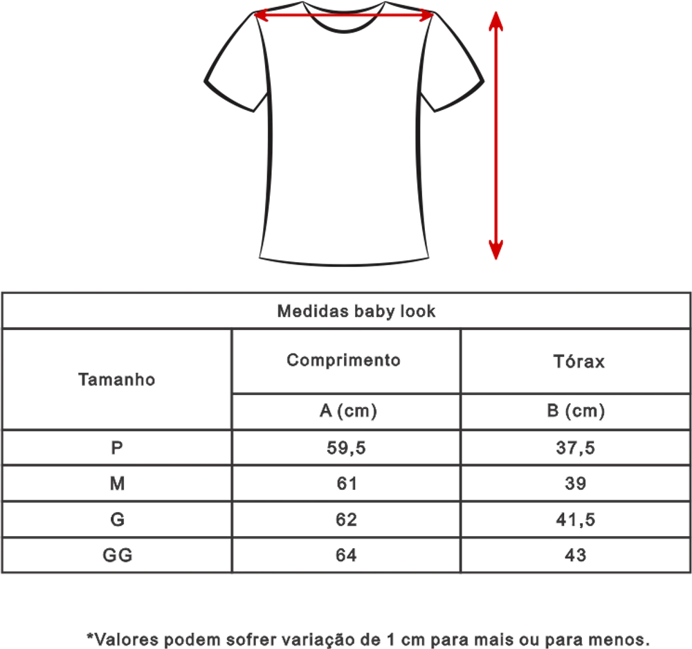 - Medidas precisas do peito e comprimento que garantem ajuste perfeito no tamanho ideal (P, M, G e GG).