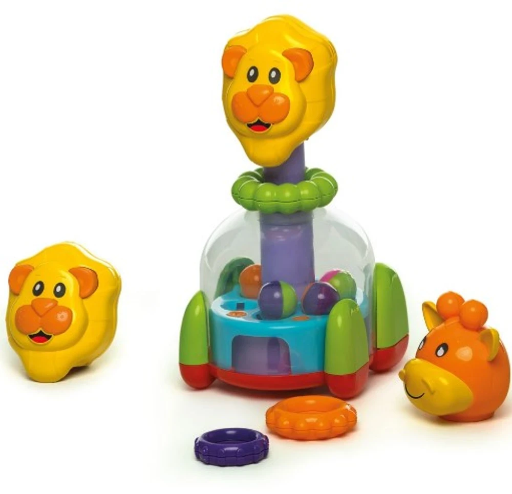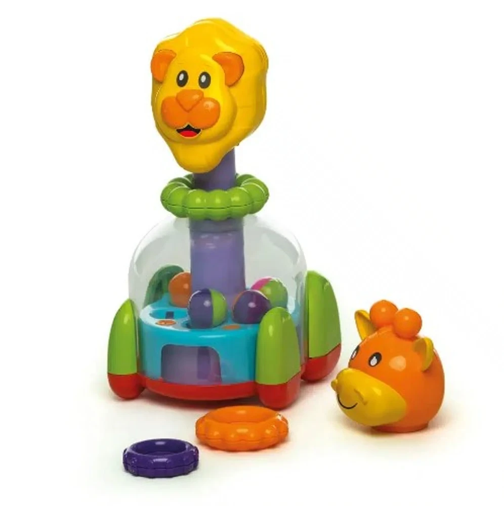 A surpresa fica ainda melhor, apertando a cabeça dos bichinhos o brinquedo gira, fazendo as bolinhas saltarem dentro da base do brinquedo, emitindo barulhinho e efeito visual com as bolinhas.