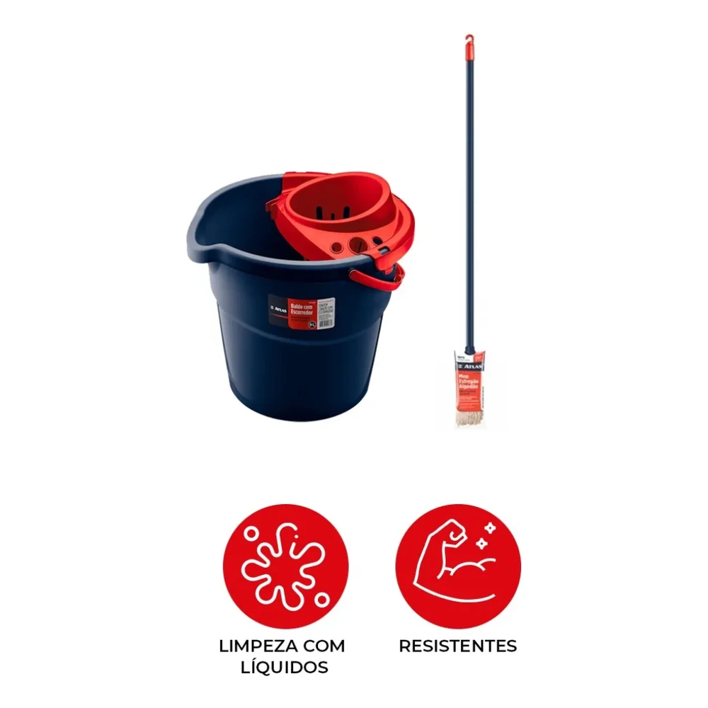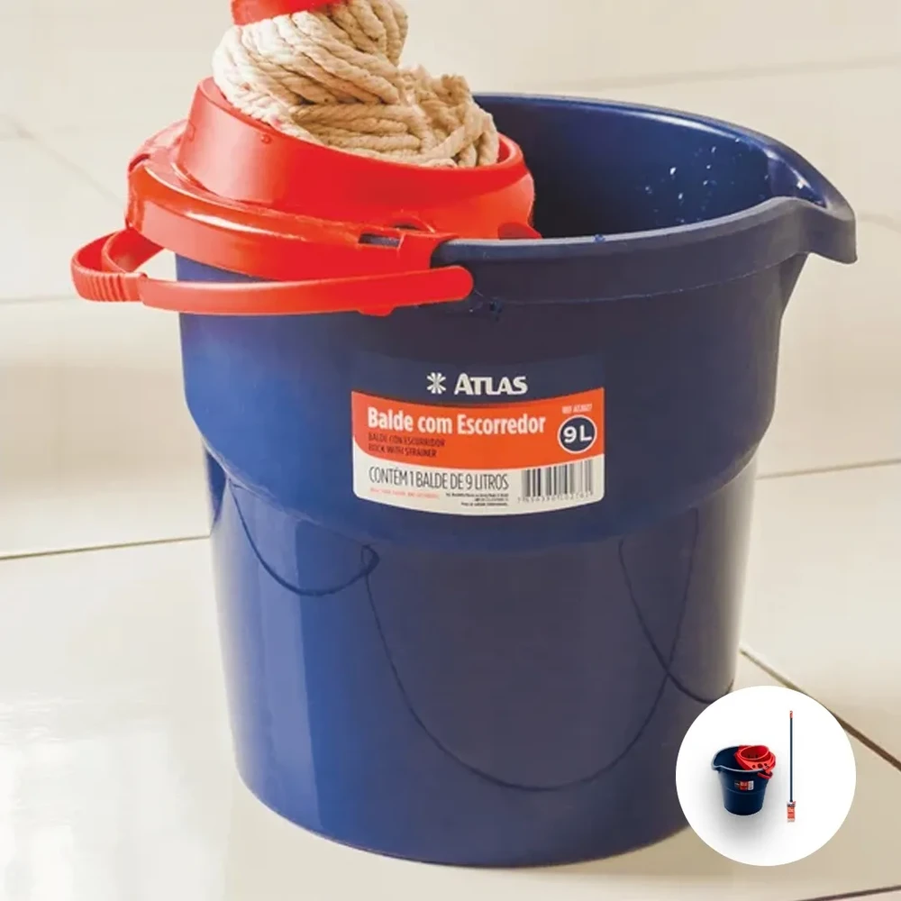 BALDE PLÁSTICO C/ ESCORREDOR 9L MOP LIMPEZA GERAL ATLAS Chega de sujeira acumulada e dificuldades na hora de espremer o mop! O Balde com Escorredor 9L AT2027 Atlas é a solução ideal para quem busca praticidade e eficiência na limpeza. Compacto e resistente, ele facilita o dia a dia, reduzindo esforço e garantindo maior agilidade na remoção de sujeiras e líquidos. Projetado para oferecer máxima eficiência, o Balde Atlas possui capacidade de 9 litros e um cesto escorredor integrado, permitindo torcer o mop esfregão de forma prática e sem contato direto com a água suja. Seu material plástico resistente garante durabilidade e leveza, tornando o transporte mais fácil e seguro.