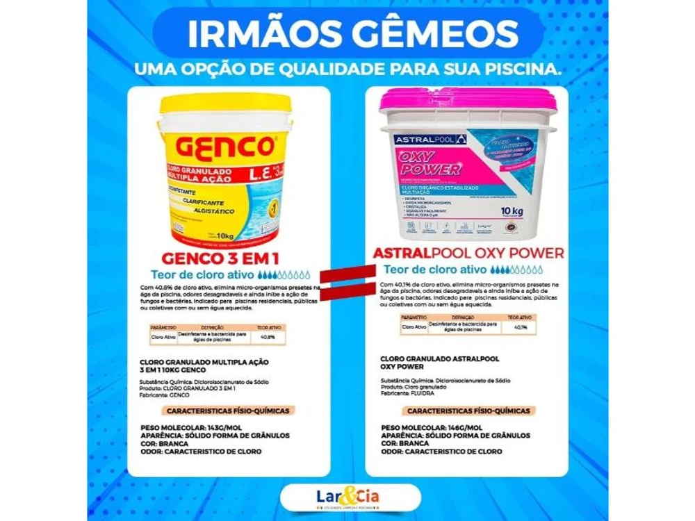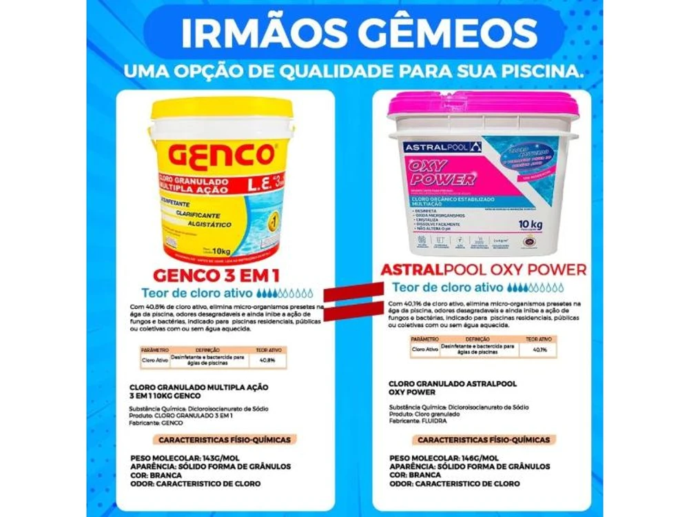 Teor De Cloro: 40%p/p (Sódio Dicloro-s-triazina-triona) + 16% oxigenação (combate os microorganismos)