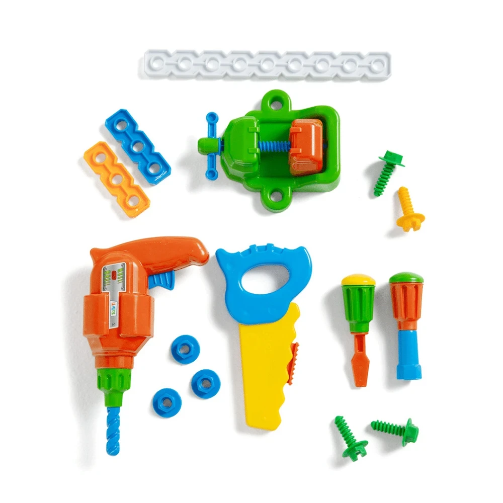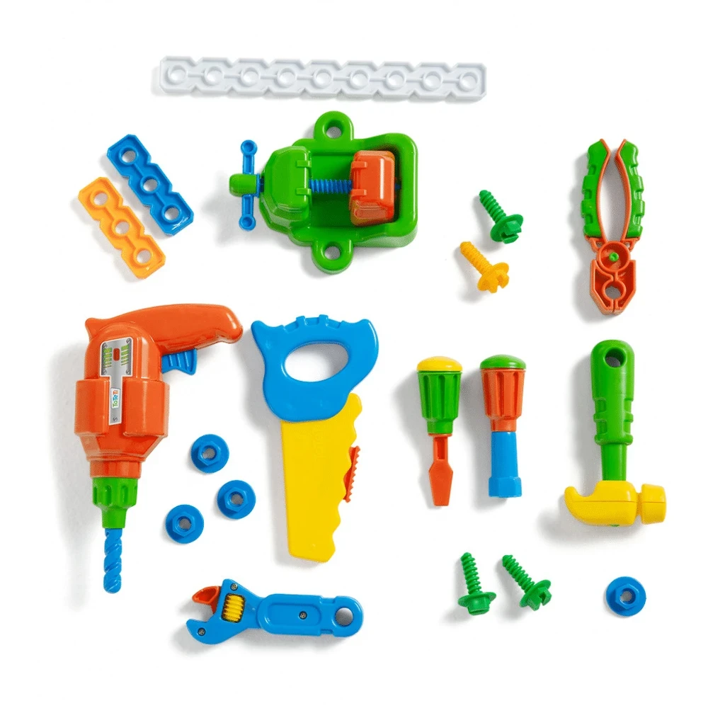 Contém: 1 bancada de trabalho, 1 manual de instruções, 2 gavetas, 1 furadeira, 1 morsa, 1 alicate, 1 chave de fenda, 1 chave de boca, 1 chave inglesa, 1 serrote, 1 martelo, 6 formas planas, 8 parafusos e 8 porcas