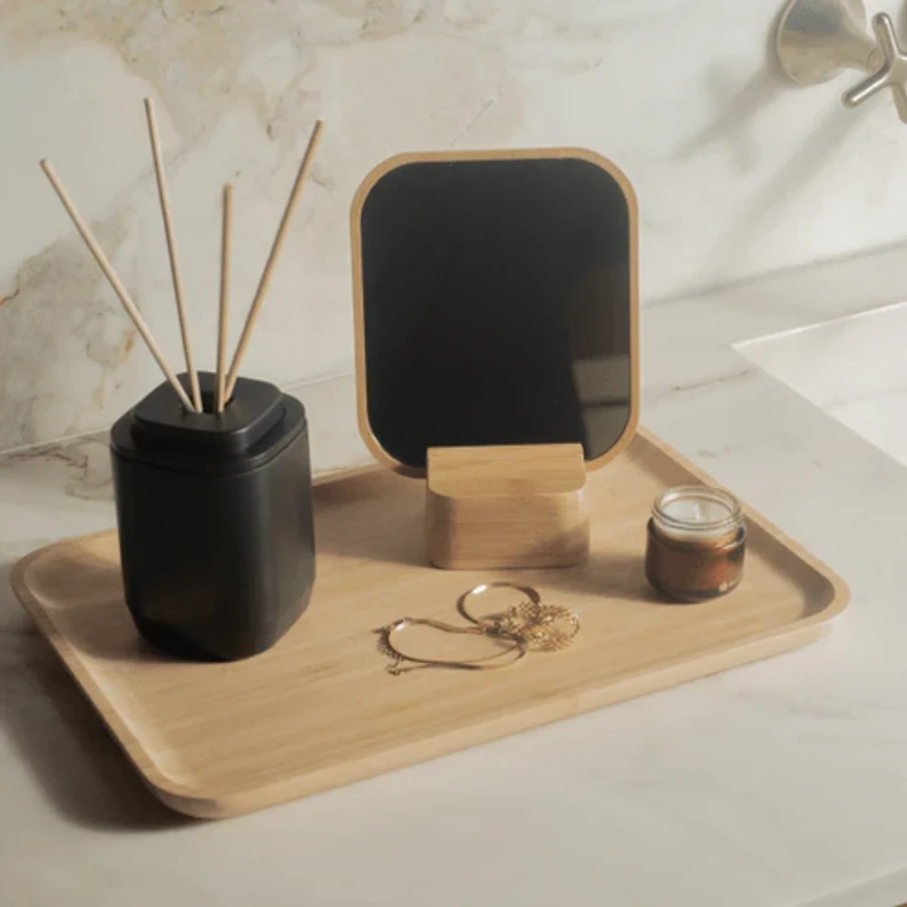 Feita em bambu, material renovável e resistente, possui acabamento suave ao toque e visual acolhedor que combina com diversos estilos de decoração. Seu formato retangular oferece espaço ideal para manter tudo em ordem sobre a bancada do banheiro, lavabo ou penteadeira, unindo praticidade e charme no dia a dia.