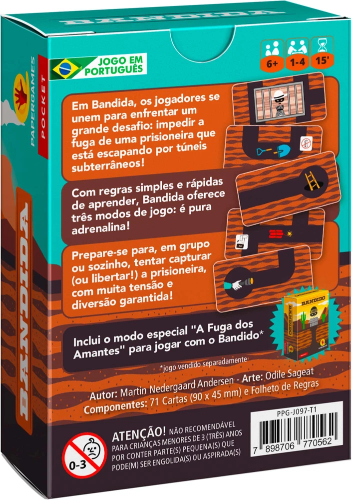 Pequeno e fácil de levar para qualquer lugar, Bandida proporciona uma experiência cheia de surpresas. Prepare-se para, em grupo ou sozinho, tentar capturar (ou libertar!) a prisioneira – com muita tensão e diversão garantida!