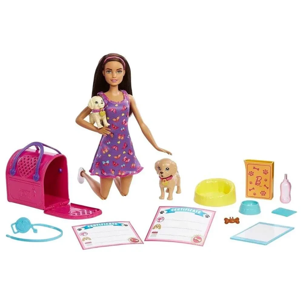 Conteúdo da embalagem: 1 boneca Barbie com vestido e sapatos, 2 cachorrinhos com coleira e placa de identificação, tapete higiênico que muda de cor, caixa de transporte, caminha, tigela, garrafa, comidinhas, petisco, toalha, brinquedo para cães e 2 certificados de adoção