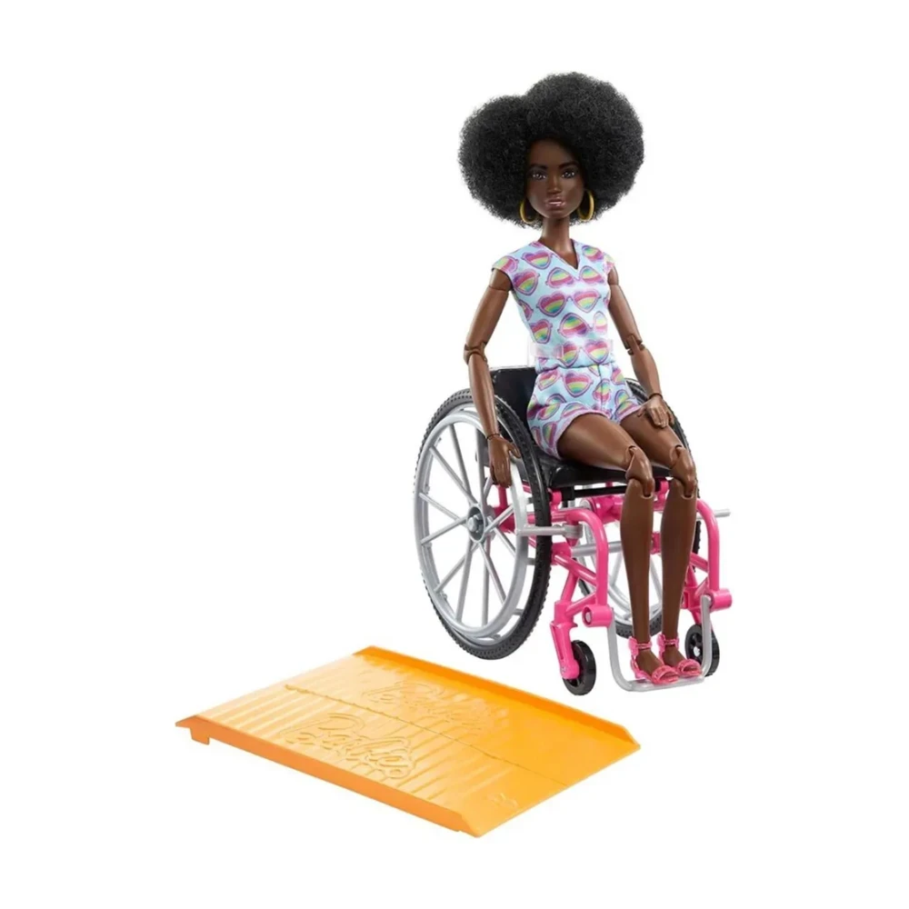 Com um visual moderno e cheio de estilo, a Barbie Fashionista celebra a inclusão e a diversidade. Acompanha uma cadeira de rodas funcional com rodas giratórias e um acessório de rampa, para que a brincadeira seja ainda mais completa. A boneca vem com look fashion e cabelo cacheado, refletindo a beleza real e a representatividade que a linha propõe.