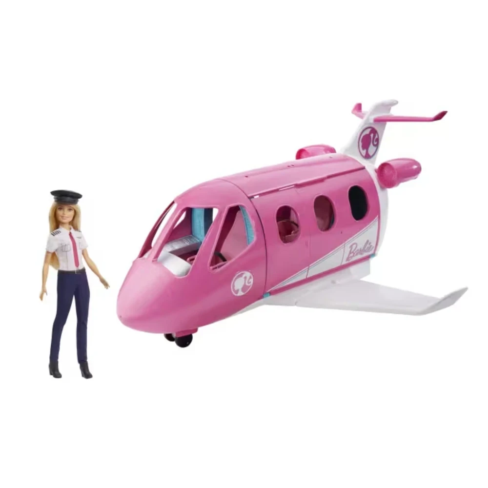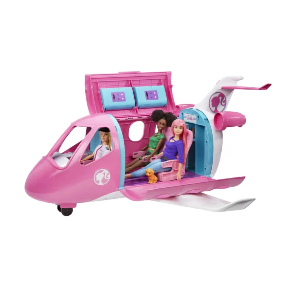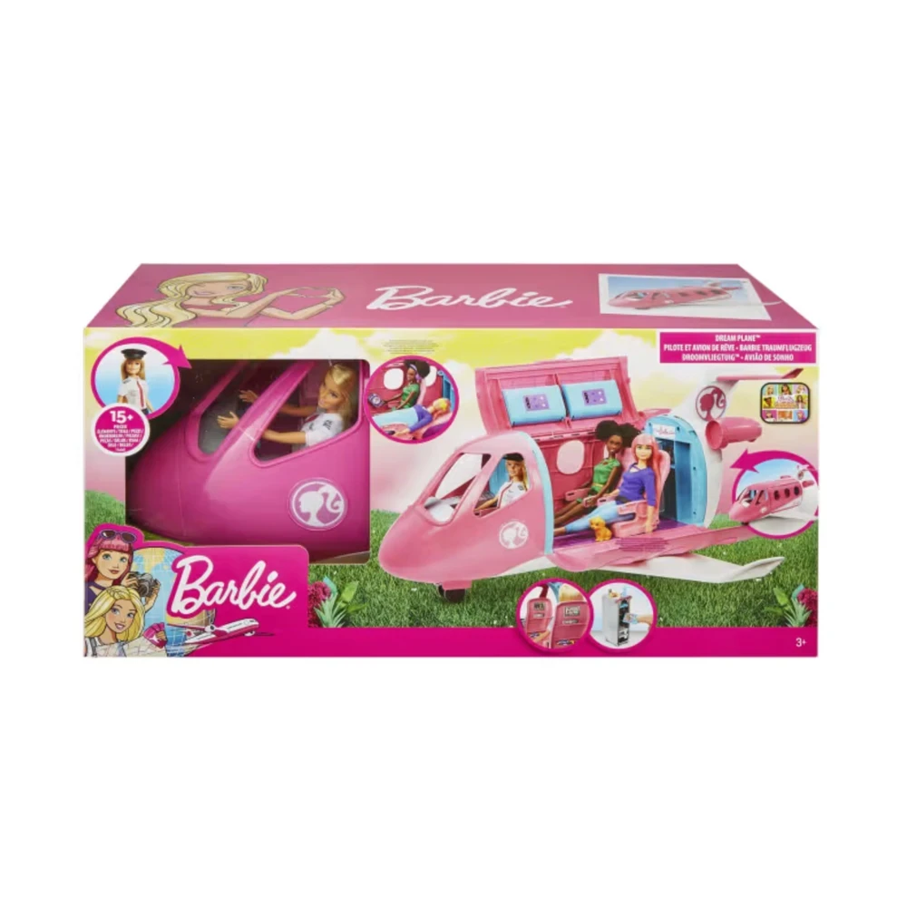 Conteúdo da embalagem: 1 avião Barbie Dreamplane, 1 boneca Barbie piloto, acessórios variados (mala, mantinhas, carrinho de comidinhas, refeições, bebidas, máscara de olhos, fones de ouvido, revista)