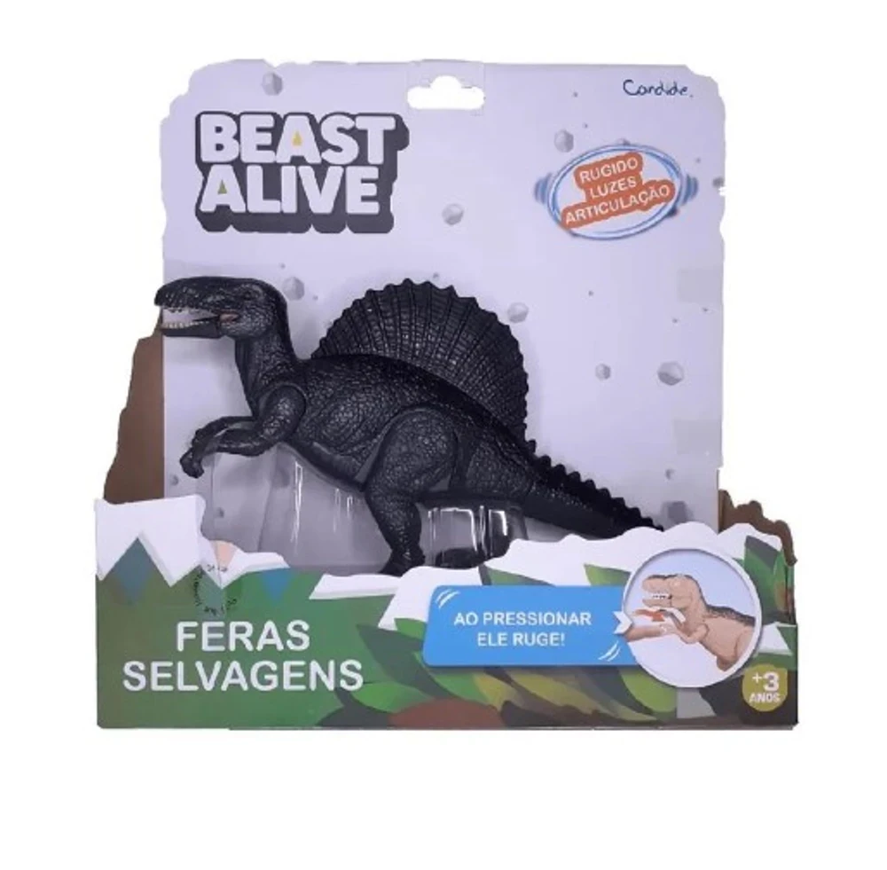 São 6 modelos sortidos para conhecer e se divertir: tiranossauro rex, espinossauro, tricerátops, velociraptor, dilofasauro e dragão.