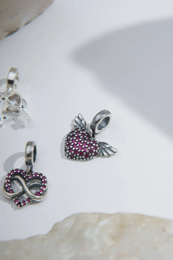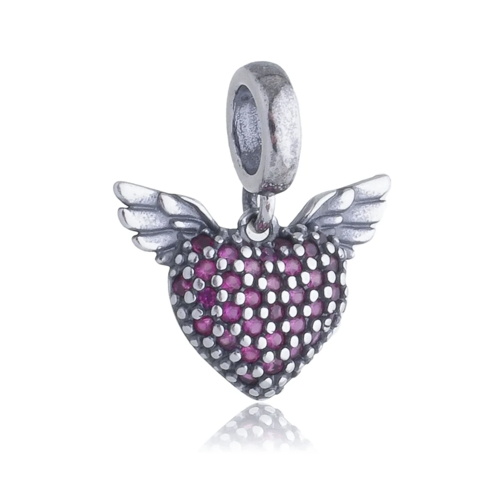 Coração Alado Rubi Deseja adicionar um toque de luxo e elegância à sua coleção de joias? Apresentamos nosso requintado Berloque de Prata com cristais na cor rubi, uma peça que exala beleza e sofisticação!
